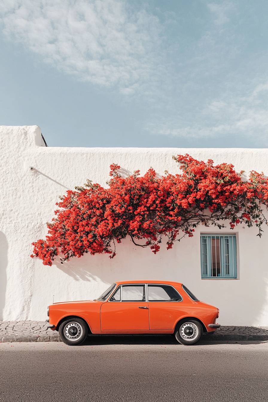 A photograph of an orange car with red flowers in front, parked outside white houses on the island of Lanzarote, against a blue sky on a sunny day. The image exhibits minimalism, natural colors, and natural lighting, with high-resolution photography that is insanely detailed and intricate, resulting in a hyper-realistic style in the manner of David LaChapelle.