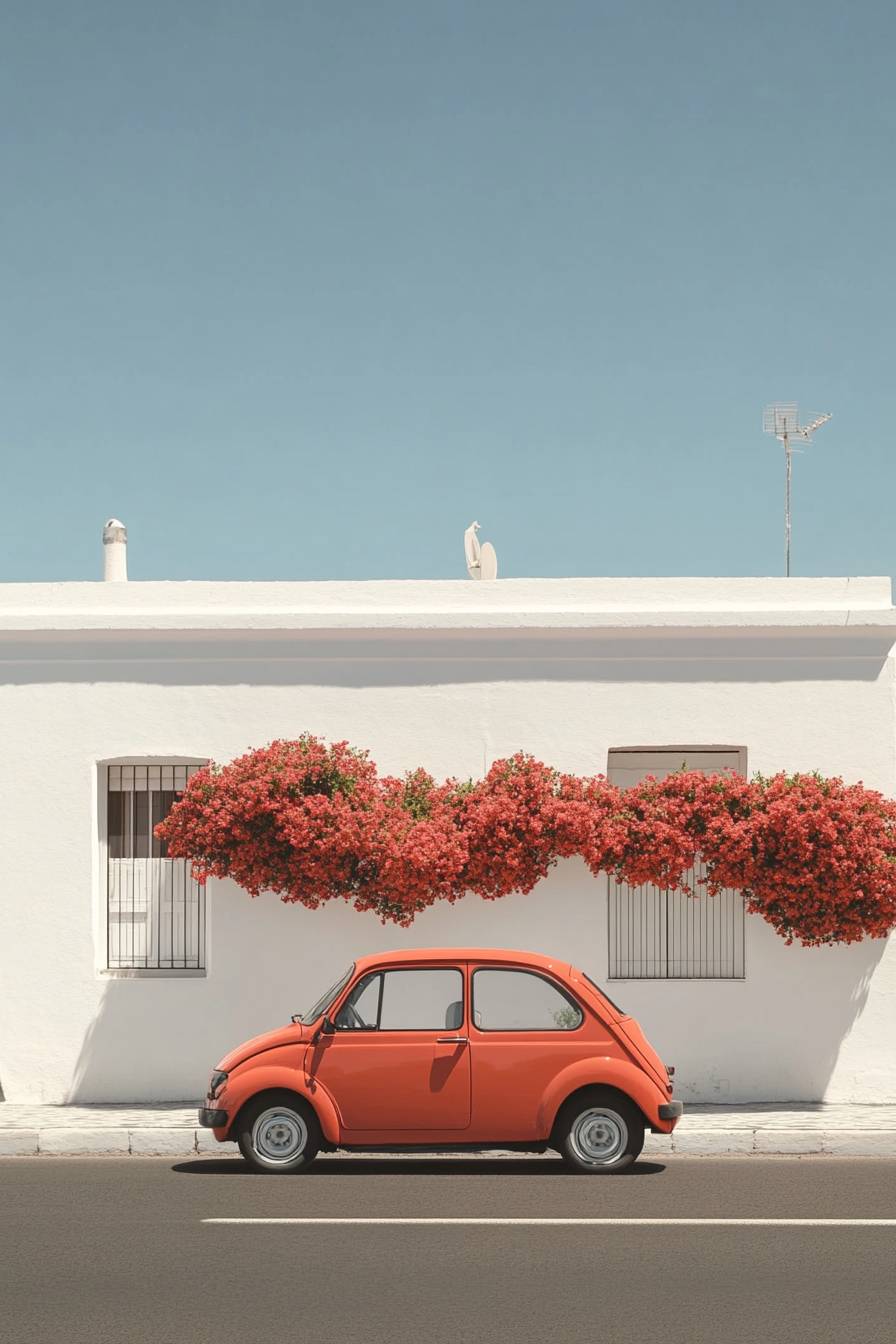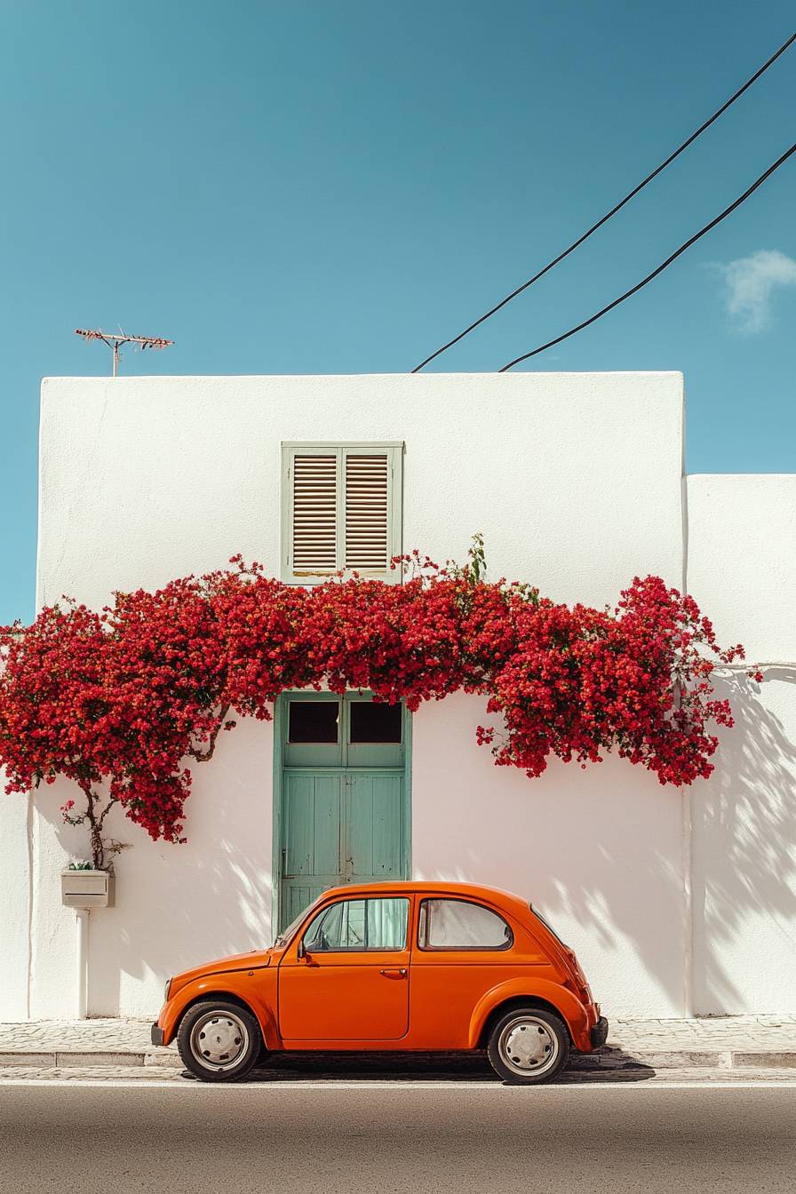 A photograph of an orange car with red flowers in front, parked outside white houses on the island of Lanzarote, against a blue sky on a sunny day. The image exhibits minimalism, natural colors, and natural lighting, with high-resolution photography that is insanely detailed and intricate, resulting in a hyper-realistic style in the manner of David LaChapelle. --ar 2:3 --style raw --personalize 7iij3kh --v 6.1