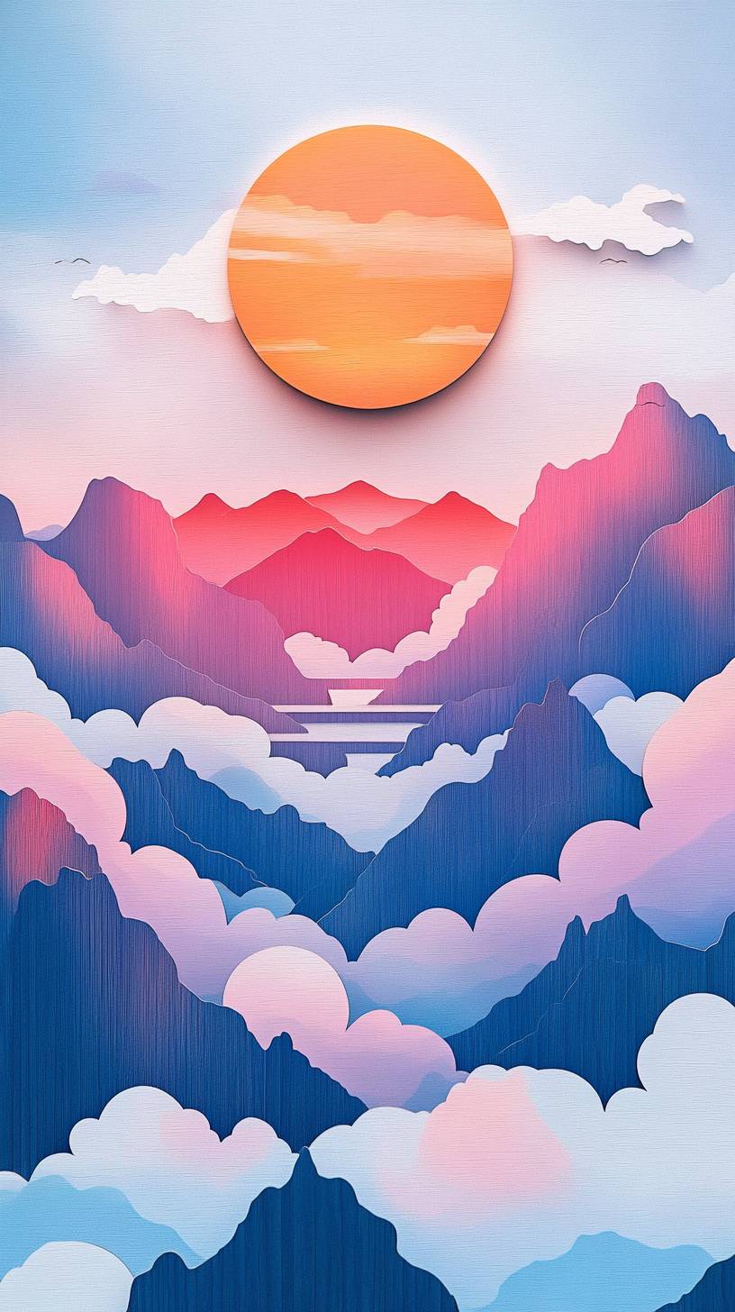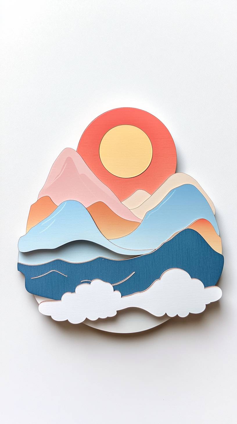 A cute three-dimensional refrigerator magnet with a simple design, featuring ancient Chinese-style landscapes as the theme, primarily in white. Made of wood, the magnet has bright colors and high-definition image quality. The background includes mountains, a sunset, clouds, and a blue sky. The overall tone is warm, with a style reminiscent of anime illustrations. It measures 12 cm in height and 8 cm in width, with a semicircular top and a rectangular bottom. It will be used as a character background. --ar 9:16 --v 6.1