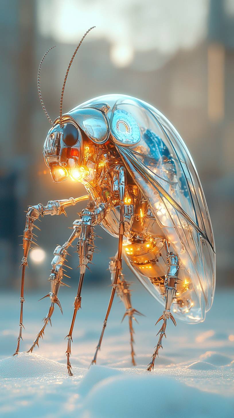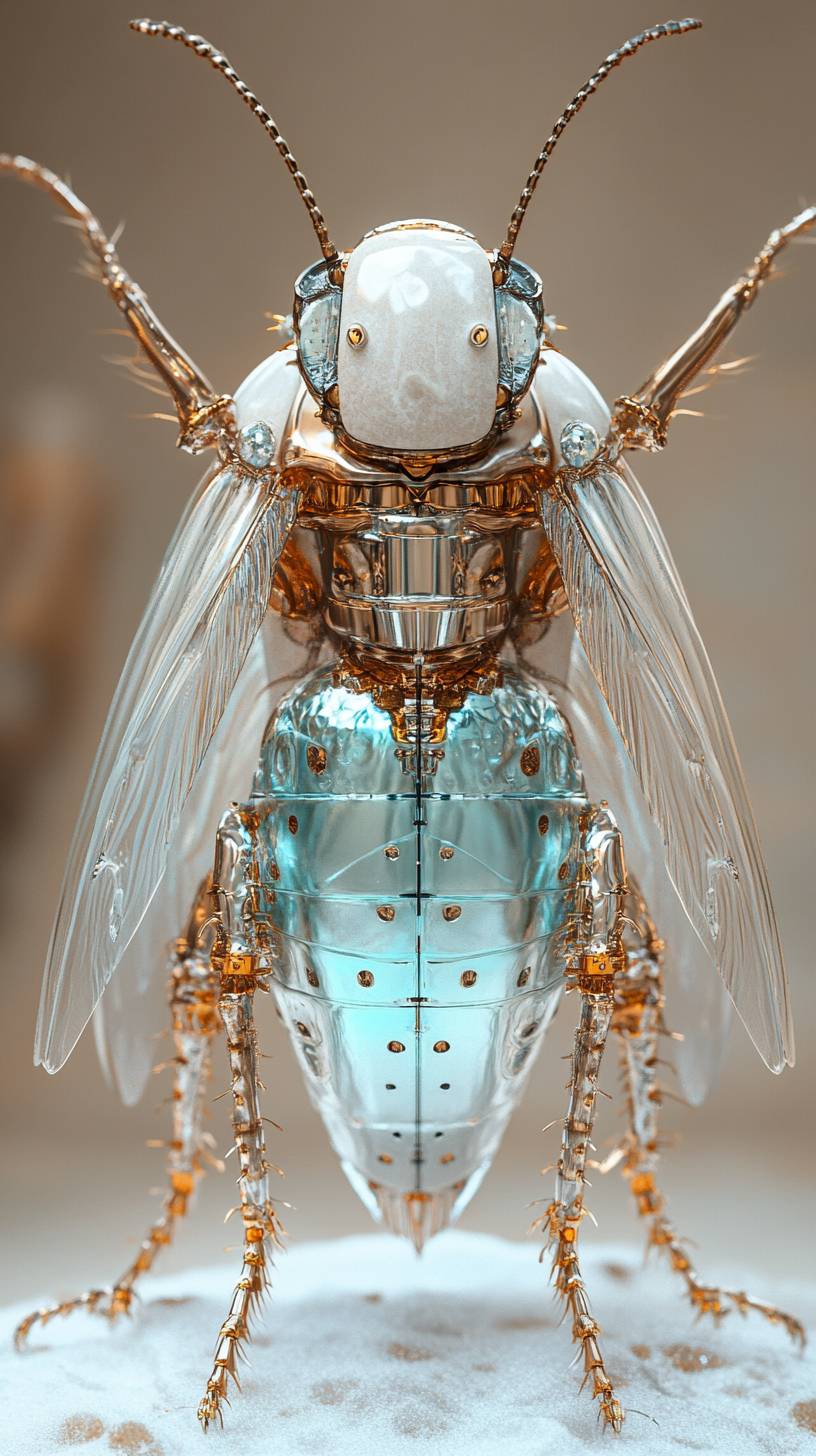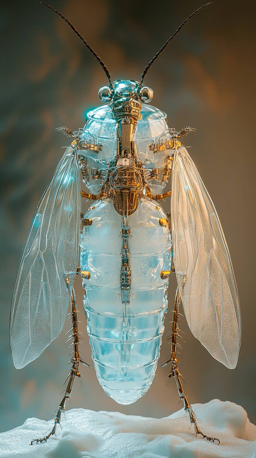 studio shot of a mechanical cockroach with light base and foam, rendered in cinema4d style, dreamy and Romantic, Ray Tracing, Ice blue and silver white, Brandon Werfel, delicate materials, ethereal and dreamy, luminous, Translucent colors, Lavender and Pale Gold, Crystal Butterfly, mechanical parts anatomical, carbon made, with cable, the background is a beige gradient, octane render, unreal engine 5, volumetric lighting, diffuse lighting, 8k, hyper-detailed, HDR --ar 9:16 --stylize 550 --v 6.1