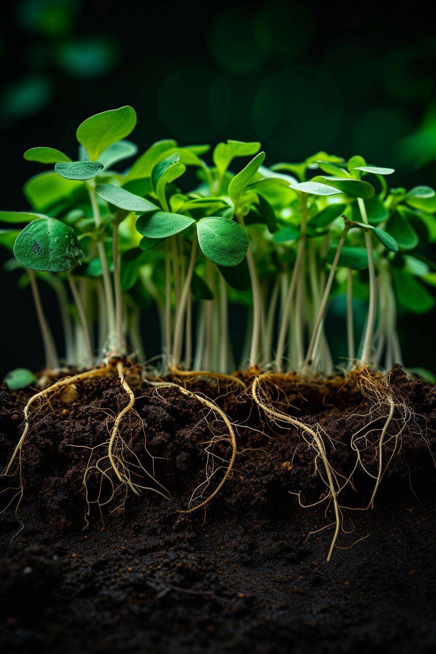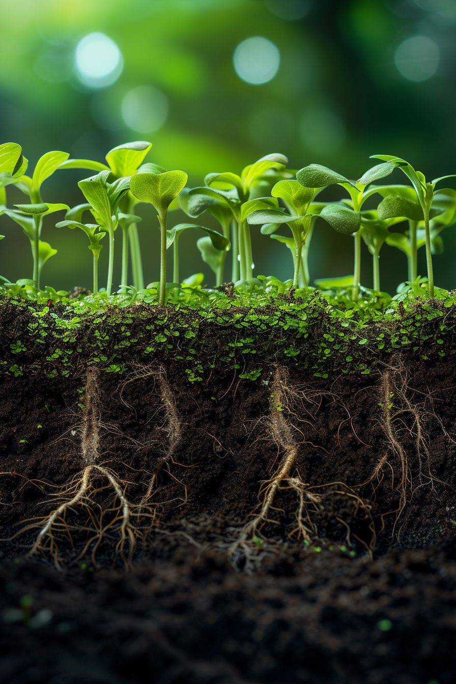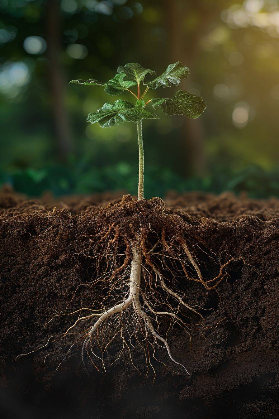 Plants growing in the land, with roots absorbing and transporting nutrients in a real scene with exquisite details.