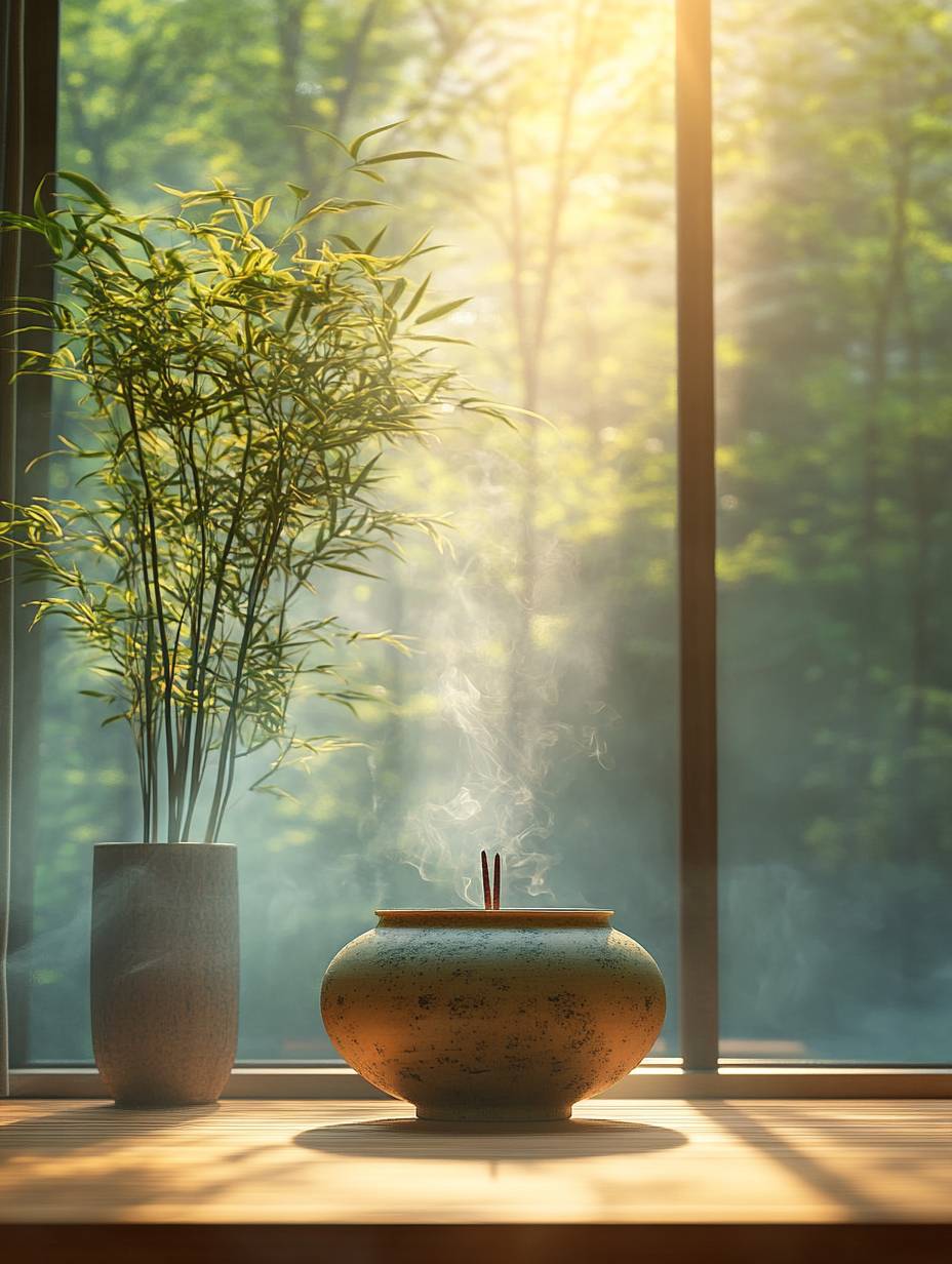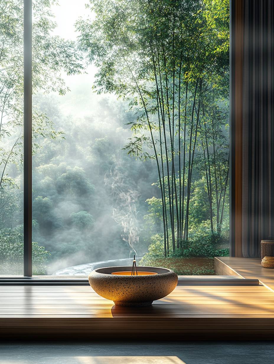 Healing, burning incense, quiet, minimalist background, bamboo stream outside window, peaceful atmosphere with green trees, green and gray gradient, realistic rendering style, cool light tones, central axis symmetrical composition, warm yellow background indoors, cool background outdoors, real photo, large panorama, panoramic view, real details, real photography, real HD image. --ar 3:4 --stylize 750 --v 6.1