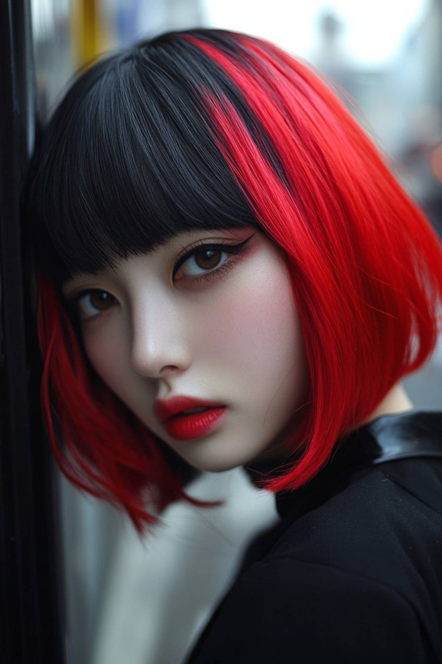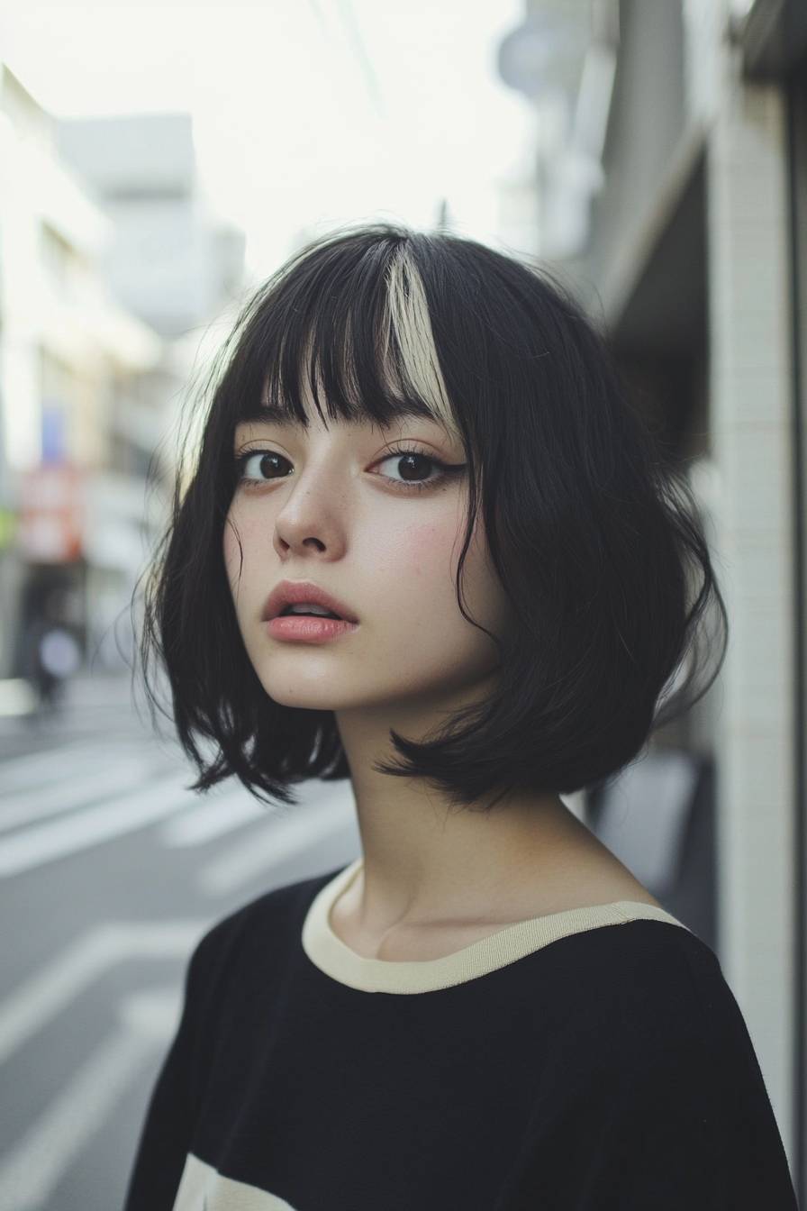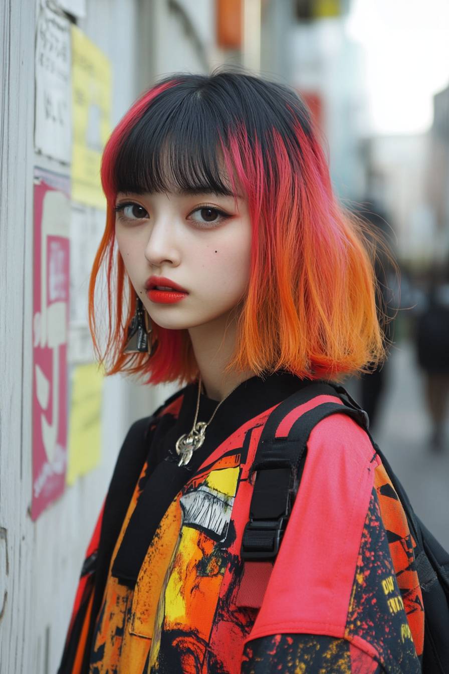 very REAL Japanese girl,street fashion,two tone color high tone hair color,bob cut,fashionable,hair catalog,harajyuku style, --ar 2:3 --v 6.1