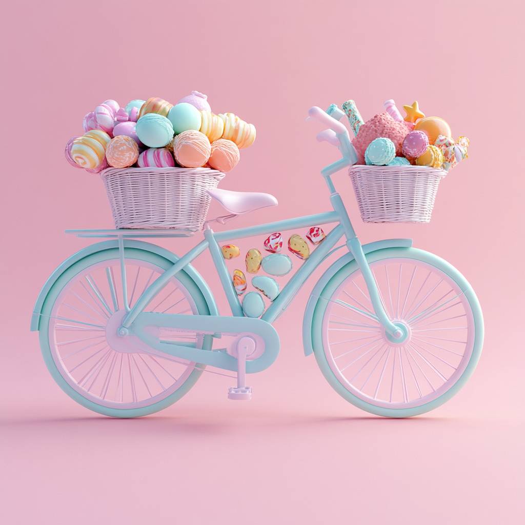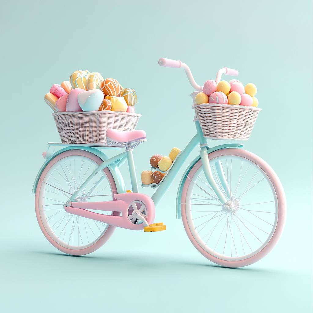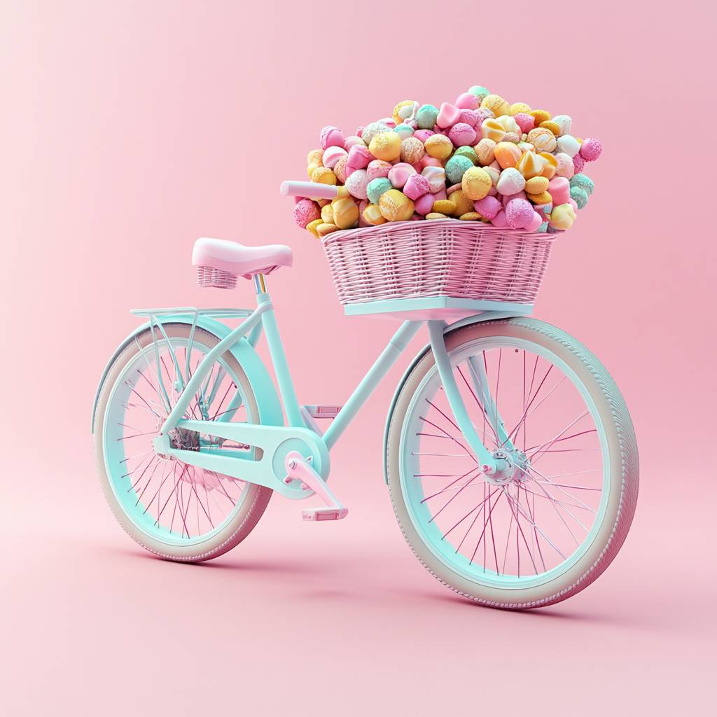 A 3D pastel-toned bicycle filled with sweets, detailed and high resolution.