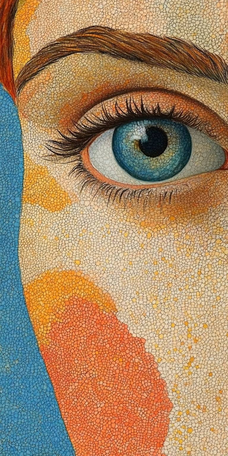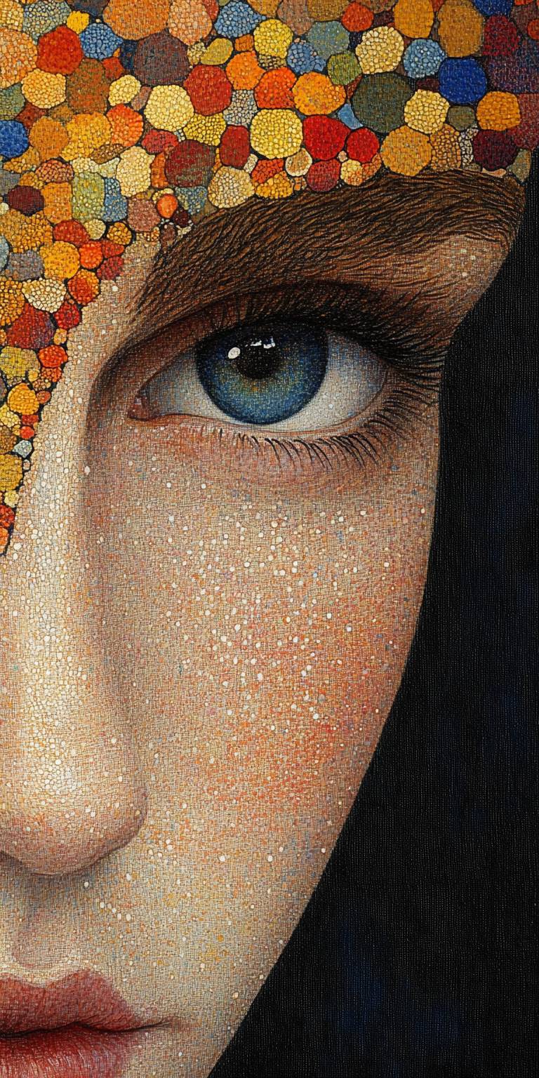 Watercolor pointillism showcases rich colors and bright eyes over the background and face of an art deco model.