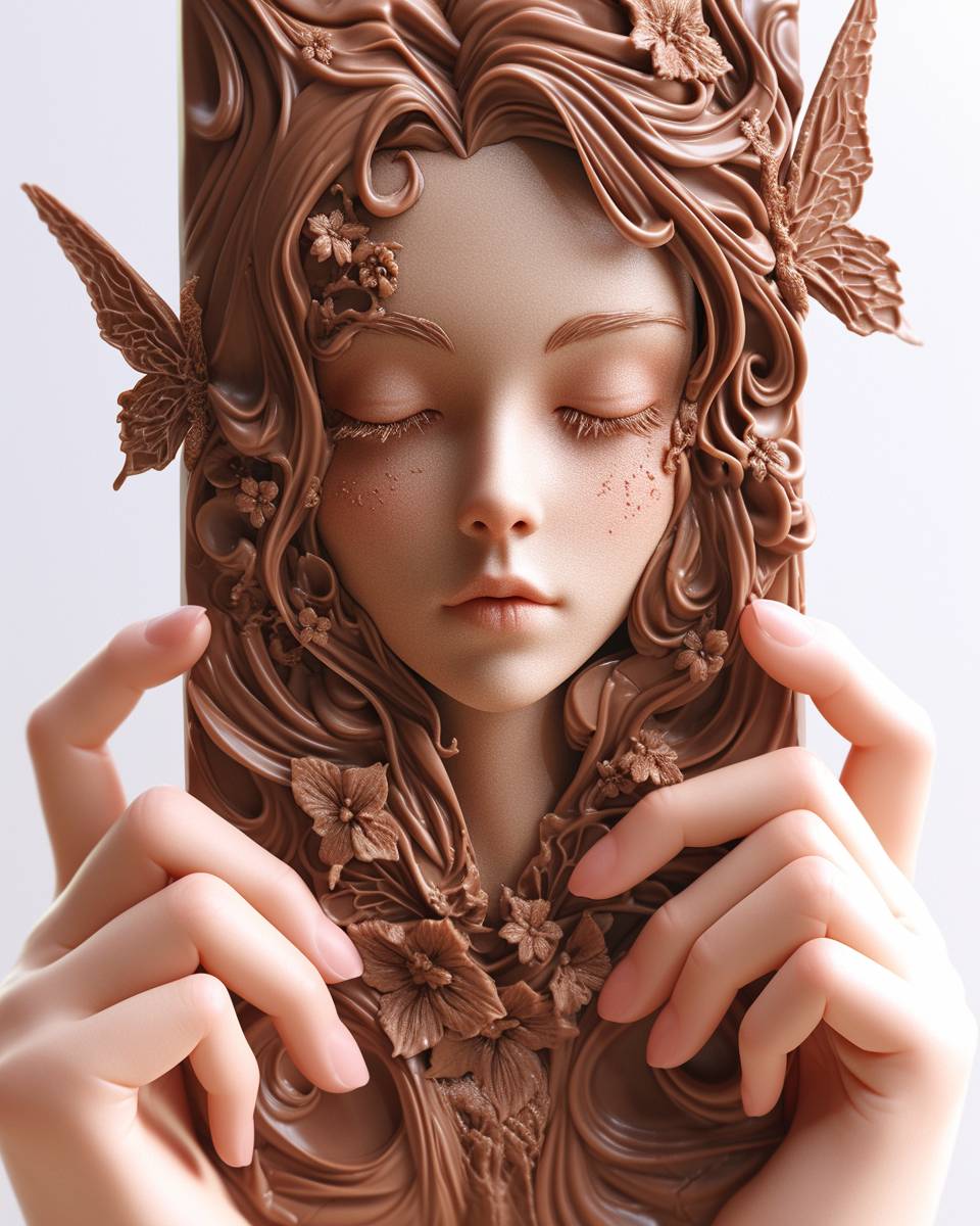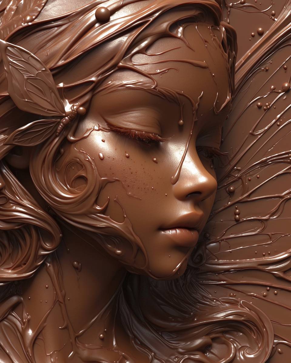 chocolate Fairy art, chocolate portrait, dark smooth chocolate, glossy texture, chocolate replica, chocolate carving, hyper-realistic details, edible art