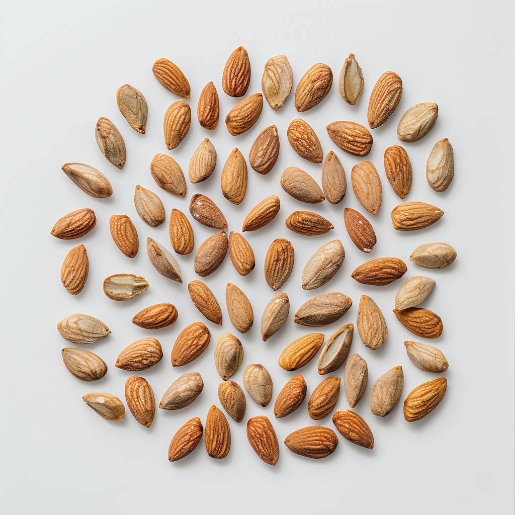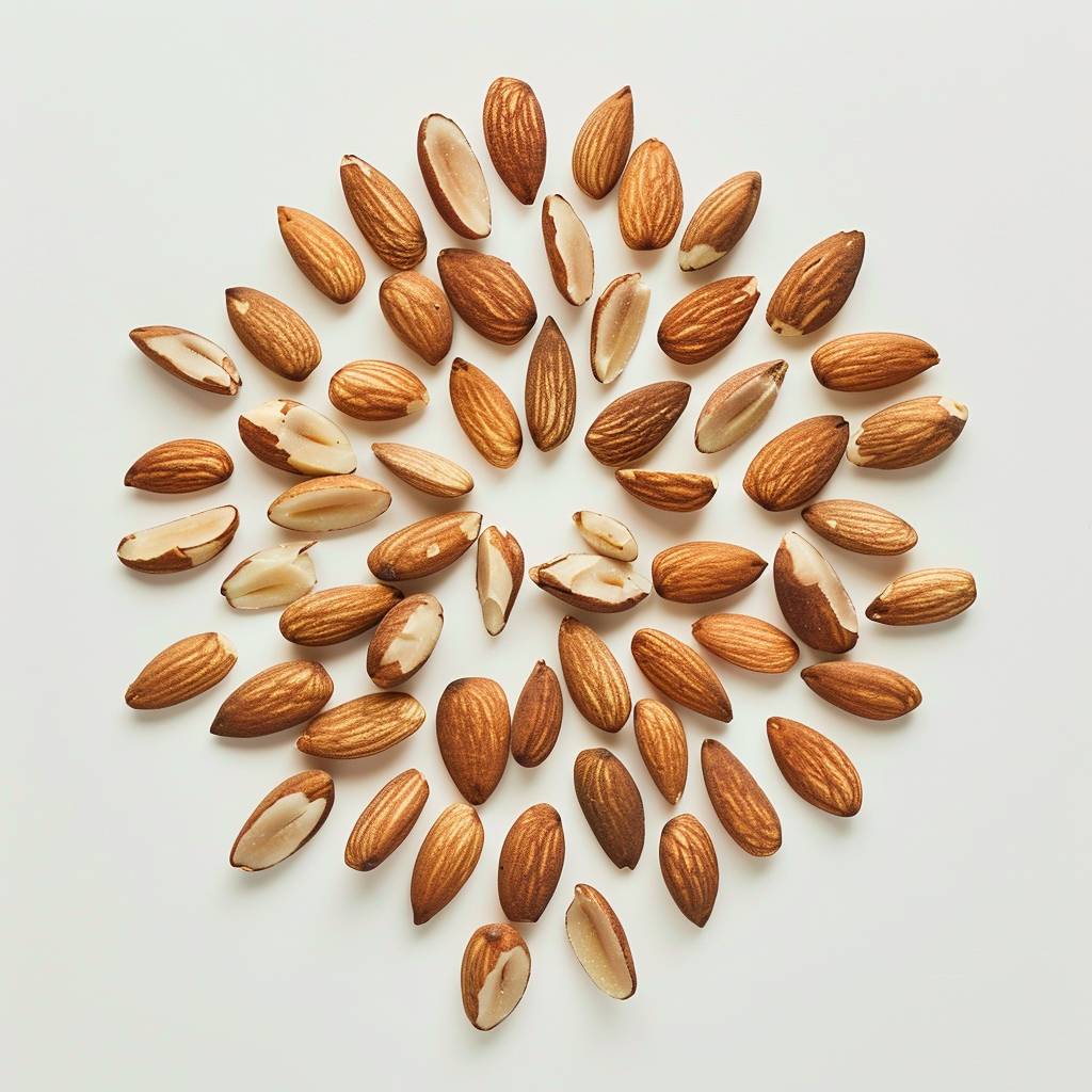 Top view of almond pieces forming the shape of [Subject], well arranged, symmetrical composition, set against white background