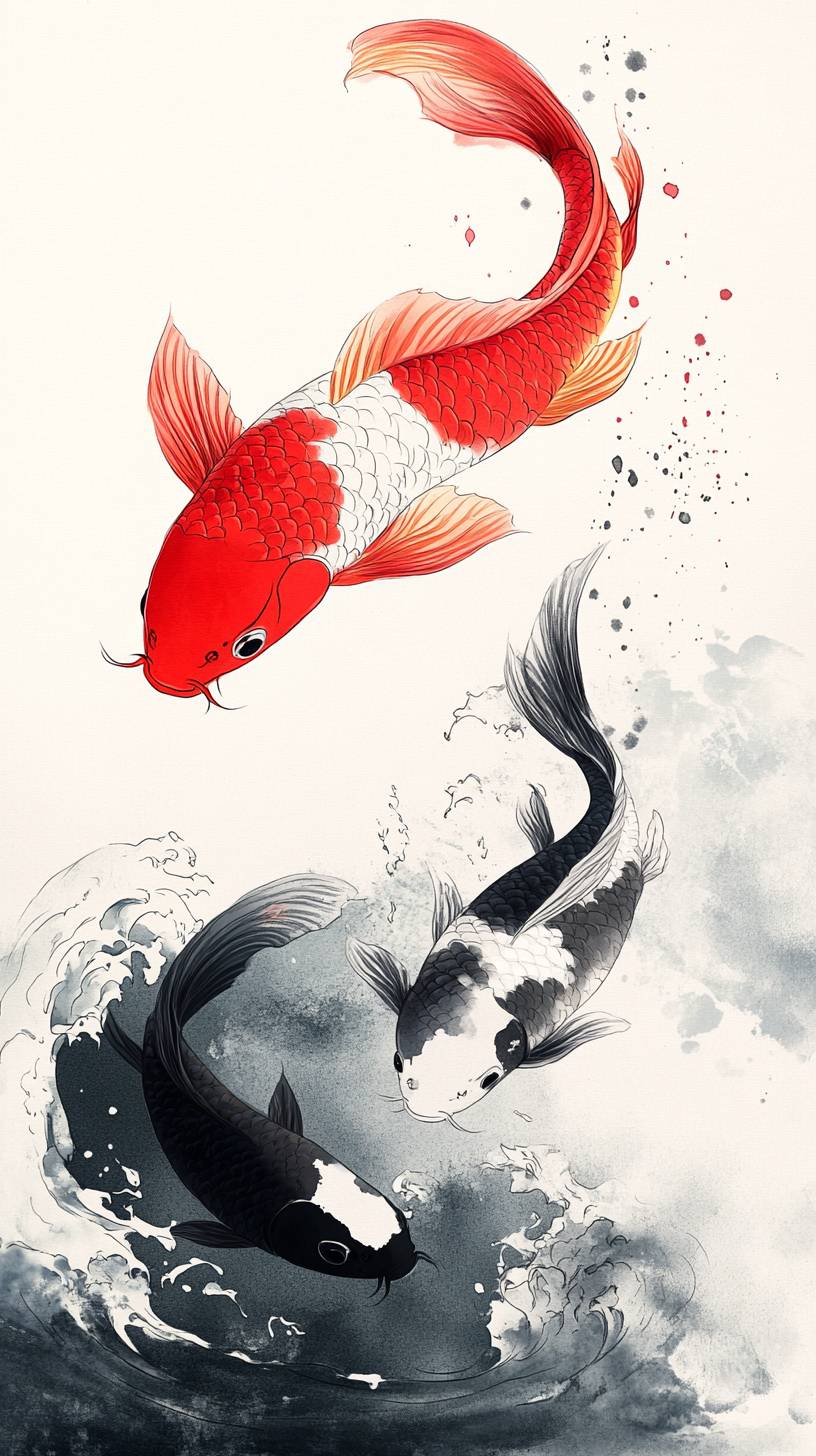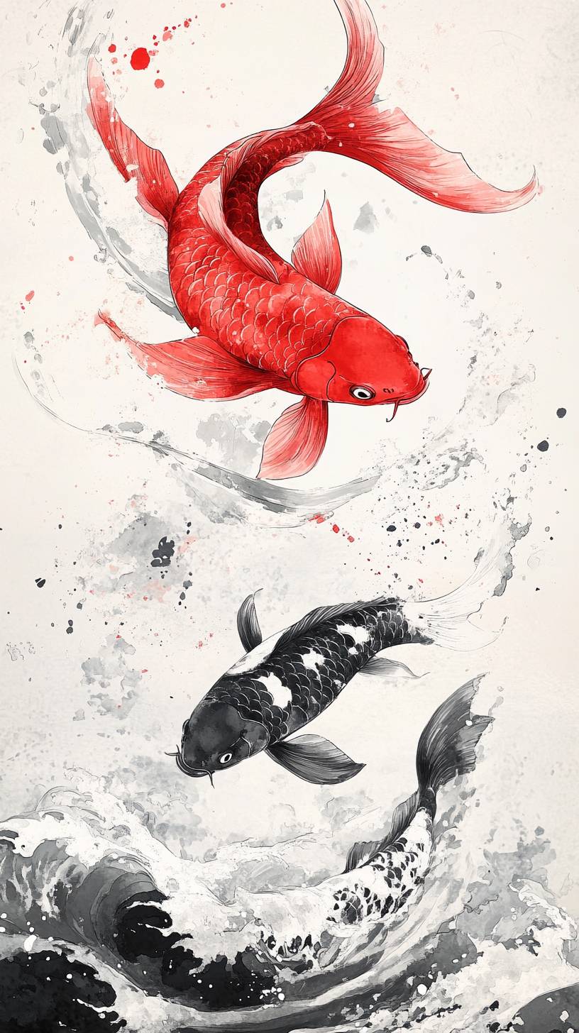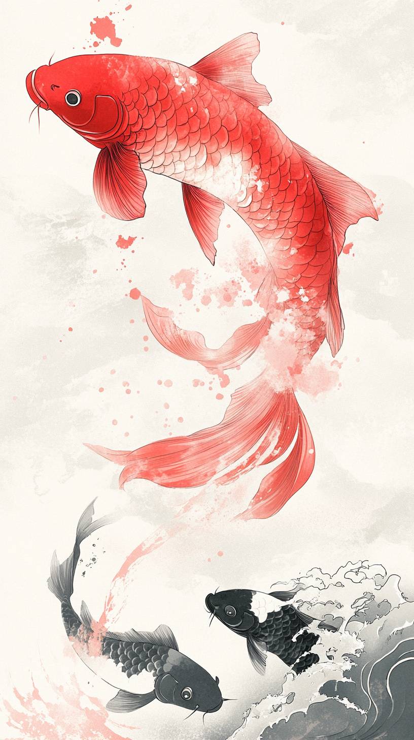 A red koi fish jumps over the waves, below are two black and white fish, depicted in the style of Chinese painting. The background is a light gray sky with clouds. The surface of the water shimmers with an ancient pink glow. It features a strong ink brush style, traditional Chinese aesthetic composition, and high-definition details. The bottom of the vertical image leaves a blank area for writing text. --ar 9:16 --v 6.1