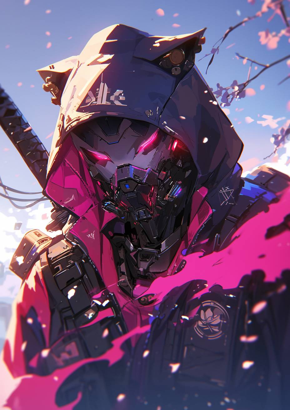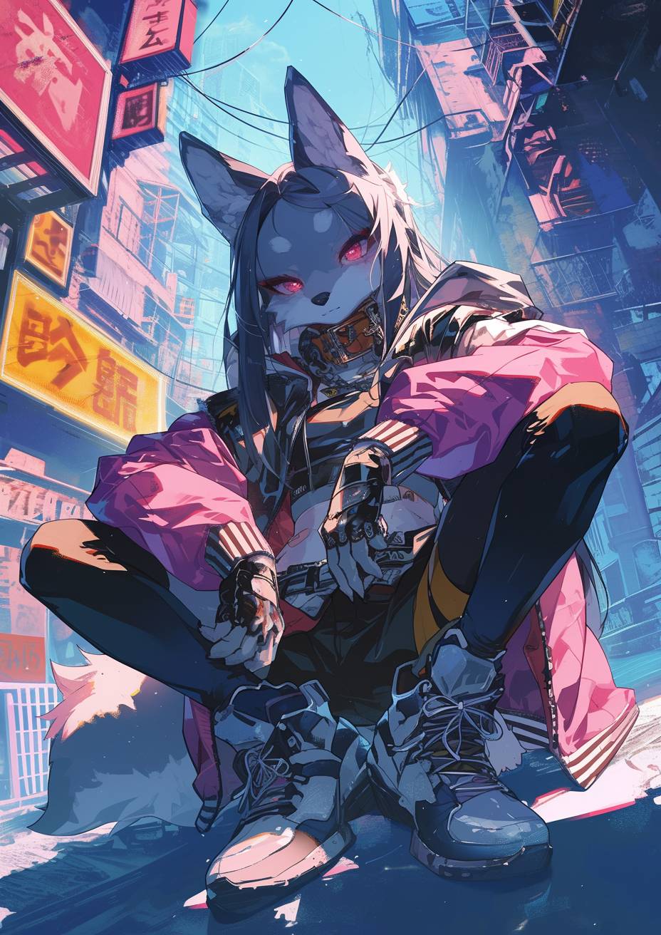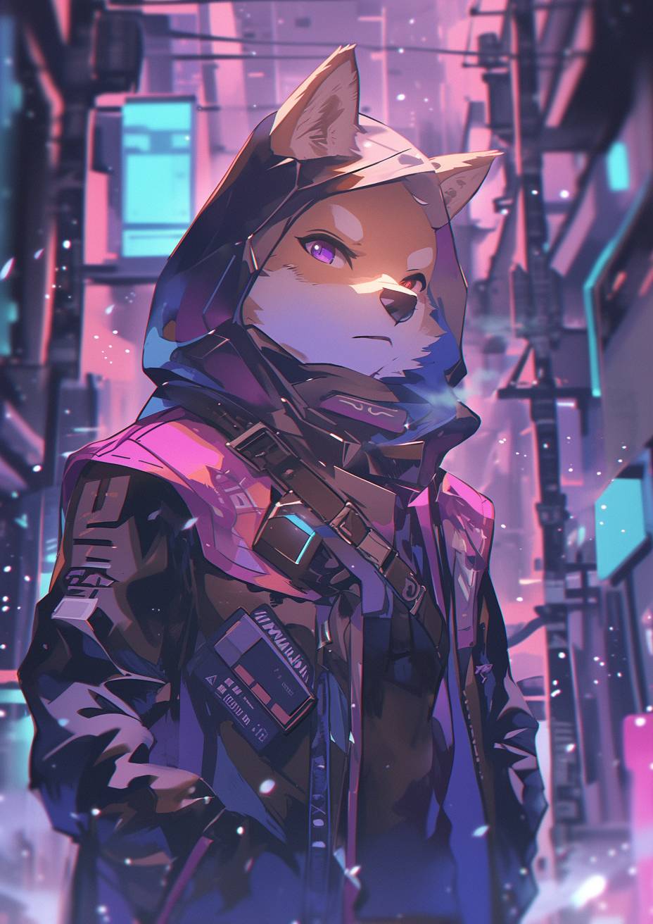 Cute anime cyberpunk shiba inu ninja assassin, tenebrism, glowing radiant degraded colors