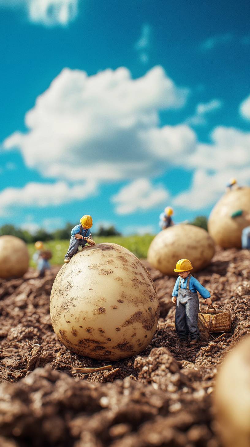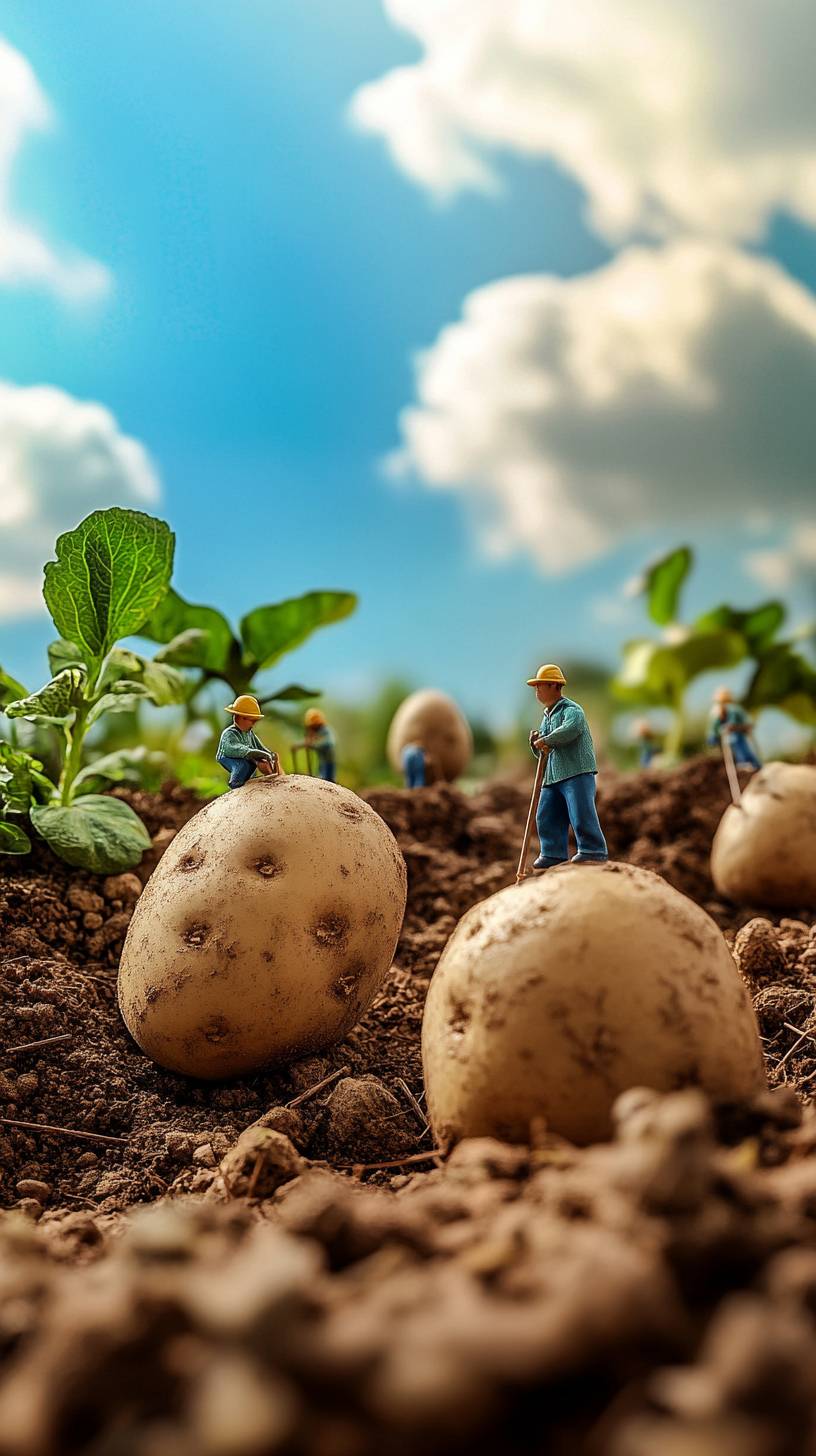 Five huge potatoes, several miniature farmers working, blue sky and white clouds, cute style, captured in high-definition quality, ultra high definition images, realistic photos, clear focus, intricate details, vivid colors, high-quality artworks