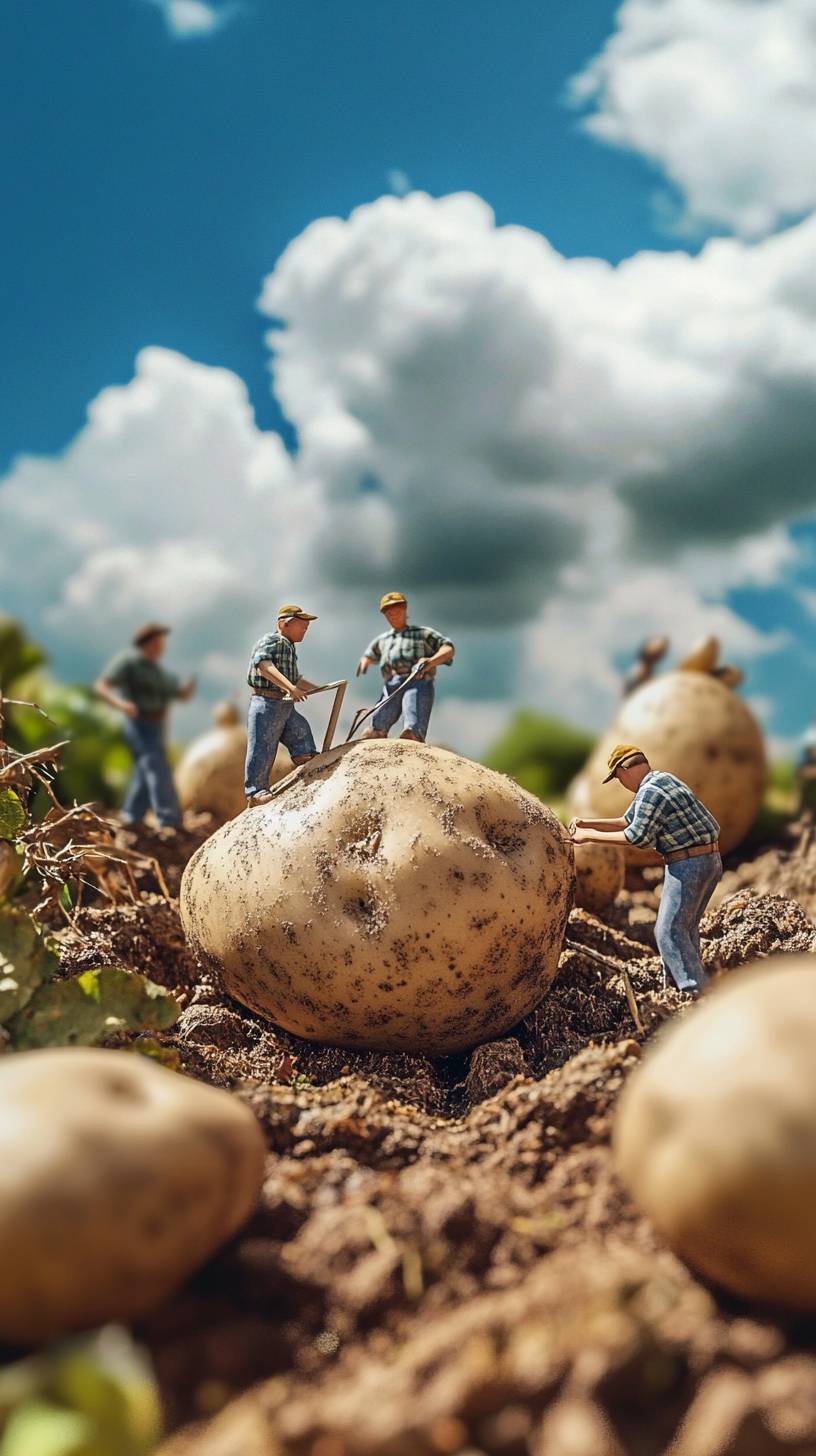5 huge potatoes, several miniature farmers working, blue sky and white clouds, cute style, captured in high-definition quality, ultra high definition images, realistic photos, clear focus, intricate details, vivid colors, high-quality artworks --ar 9:16 --v 6.1