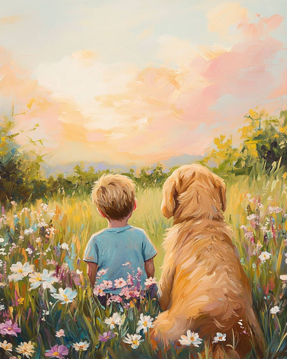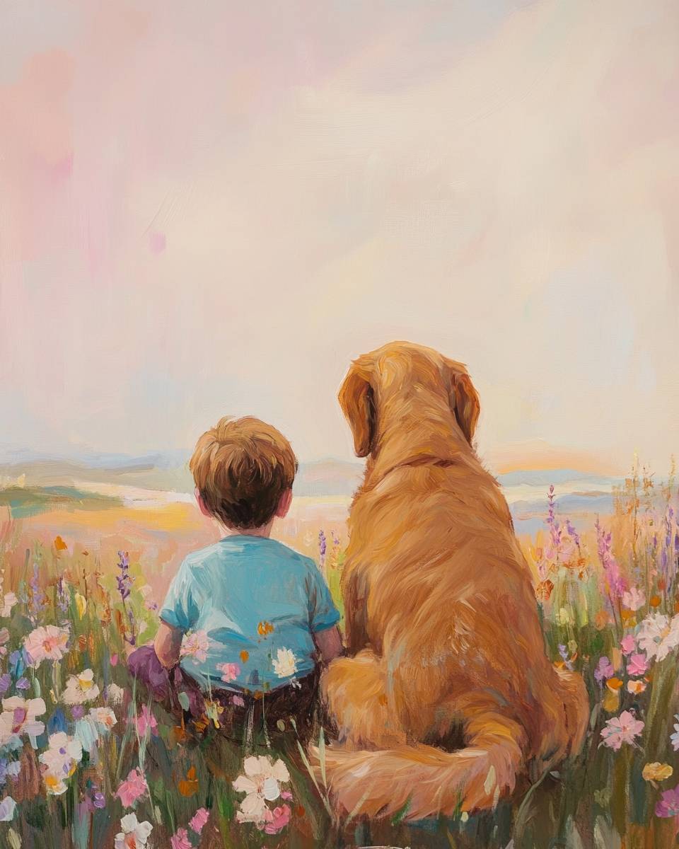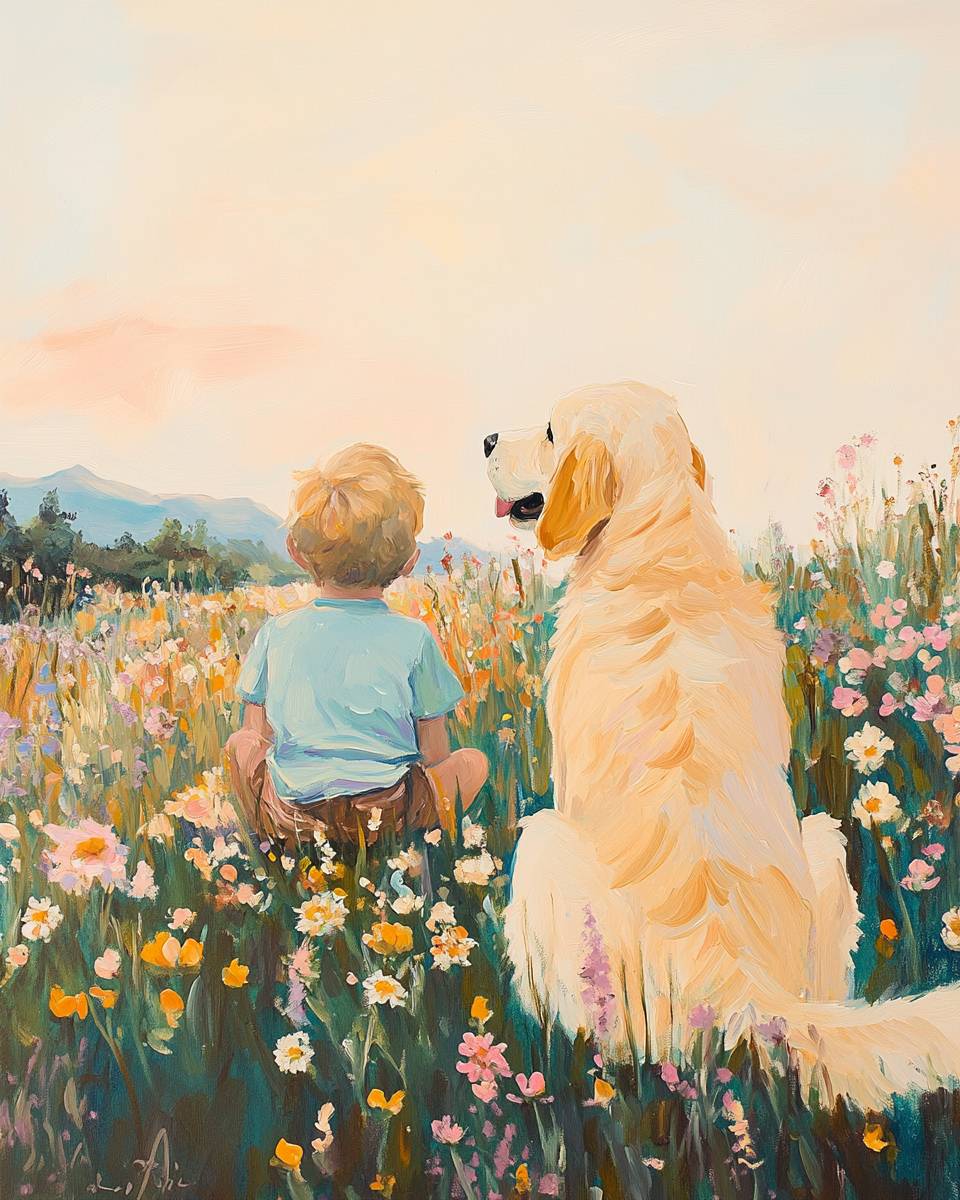 acrylic painting of the back of a little boy sitting next to the back of a golden retriever in a wildflower field by maira kalman and janet hill, pastel sunset in the background, gouache, fauvism, realism, light pink, white, gold, peach, lavender, blue, turquoise, and cream tones, light pastel color palette, intricate detail, crisp brush strokes, soft early morning light, --ar 4:5 --v 6.1