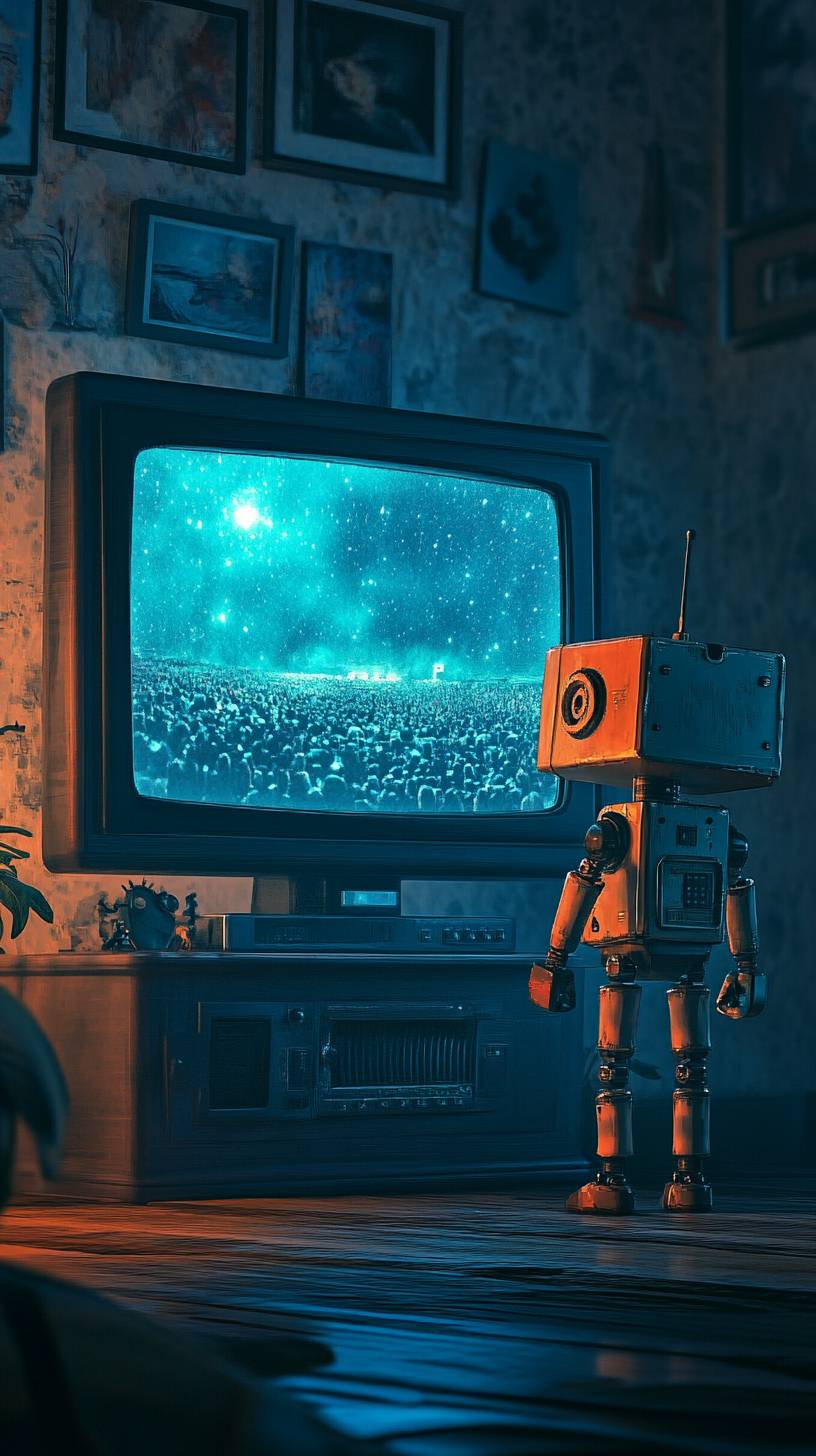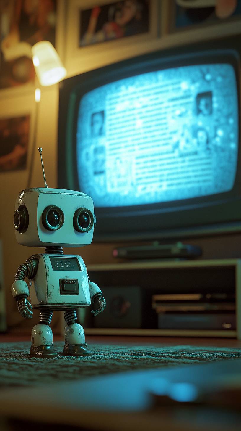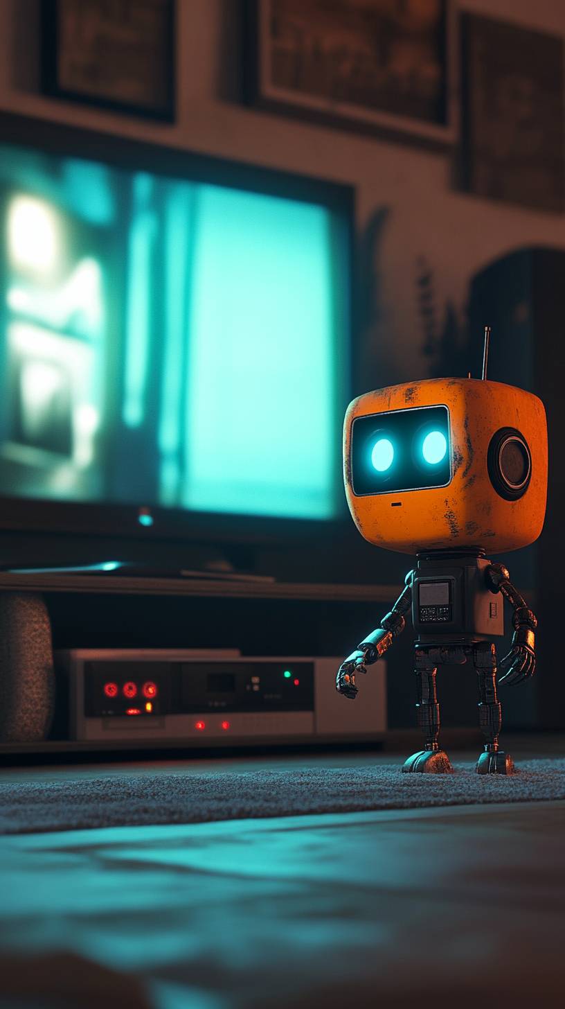 A little robot stands in front of a big TV and picks out a movie for tonight.