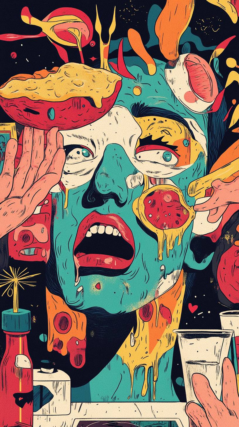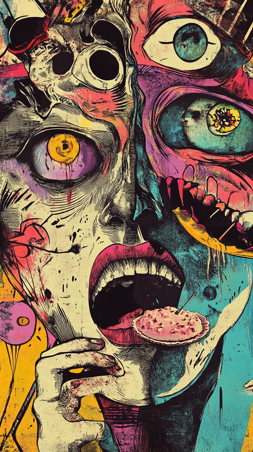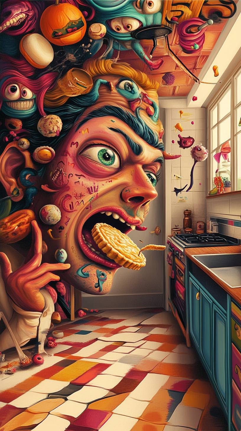 surrealistic graphics, colorful, draw faces on kitchen wallpaper, have one face with a hand throw a pie at a man in the kitchen. --ar 9:16 --v 6.1