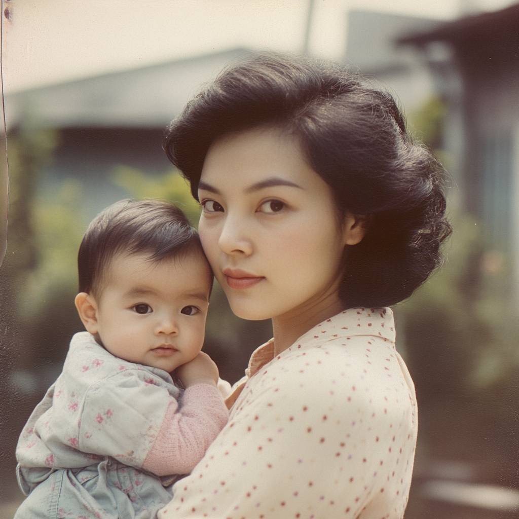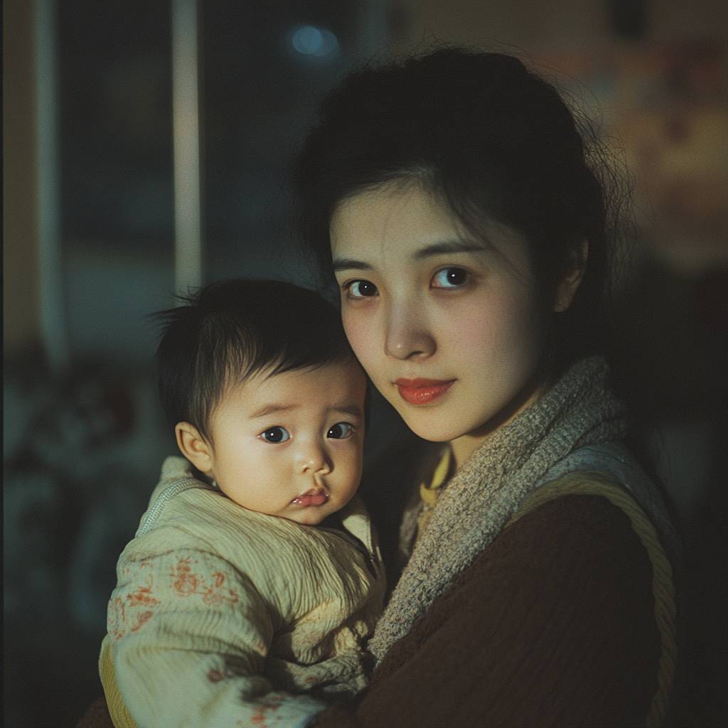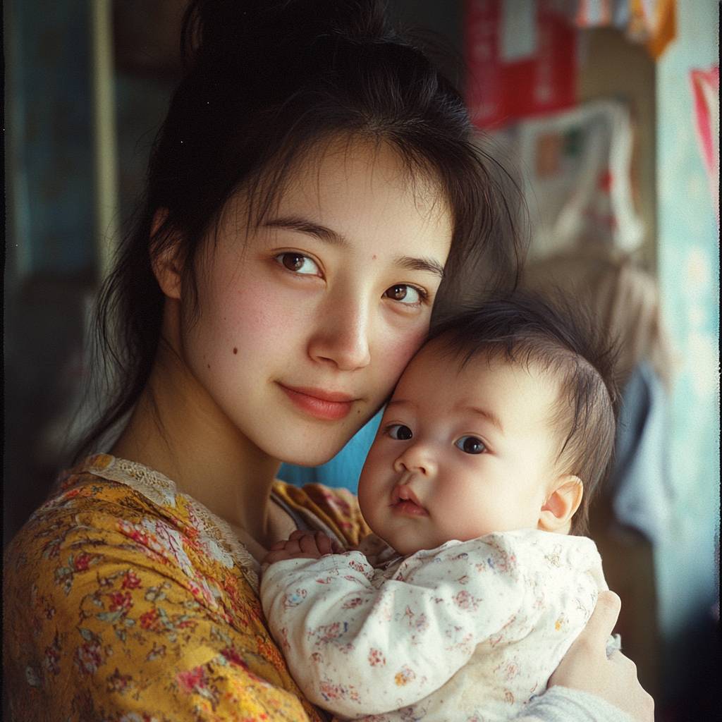 A young Chinese mother holding her baby, facing the camera in a nostalgic 1990s grainy style.