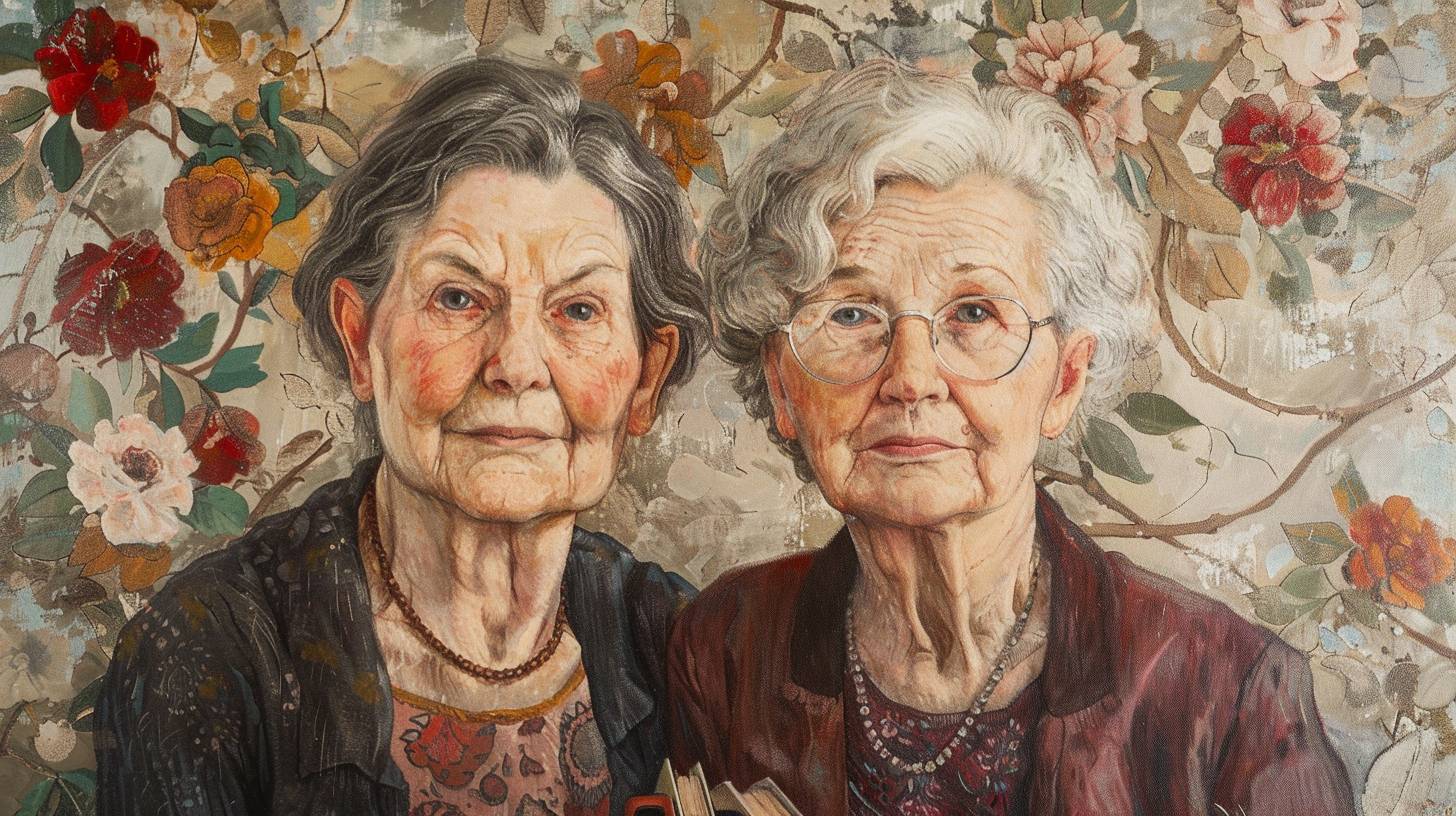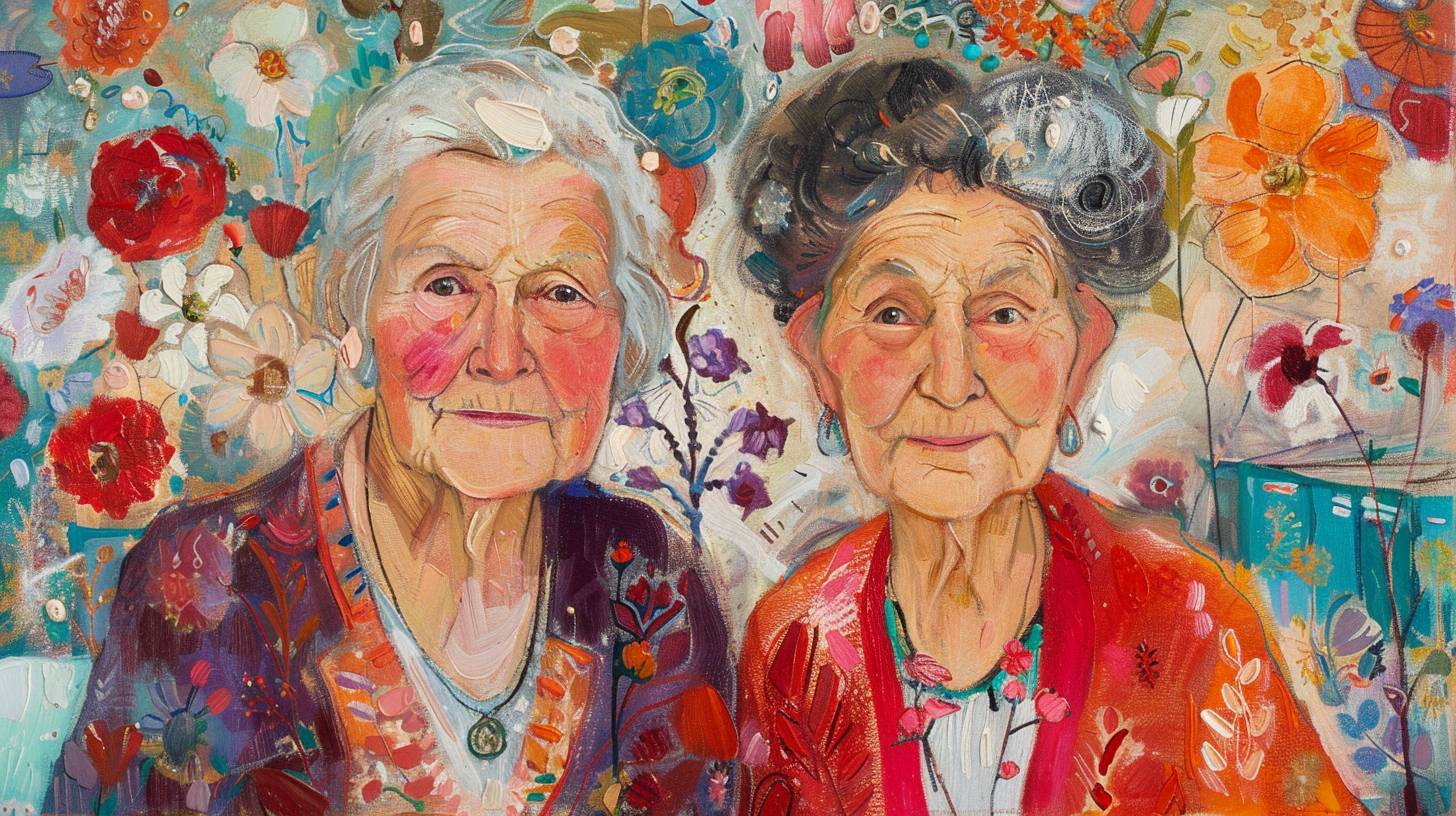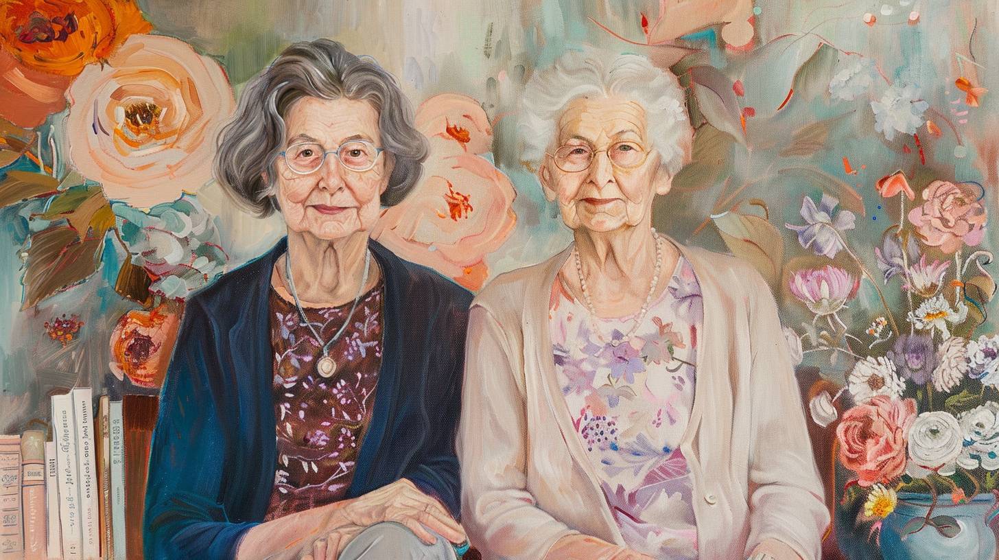 An inspirational portrait of a grandmother and mother, highlighting their strength, resilience, and love. Depict them standing side by side, with subtle symbols of their journey and achievements around them, such as books, flowers, and family heirlooms. Use symbolic elements and vibrant colors to convey their enduring spirit, drawing inspiration from the delicate, nurturing style of Berthe Morisot and the bold, vivid colors of Suzanne Valadon to capture their essence --v 6.0 --ar 16:9 --style raw