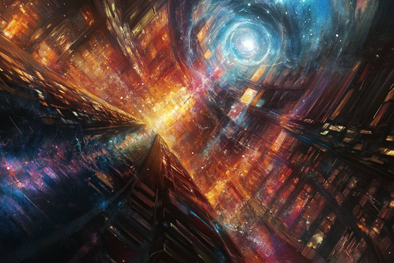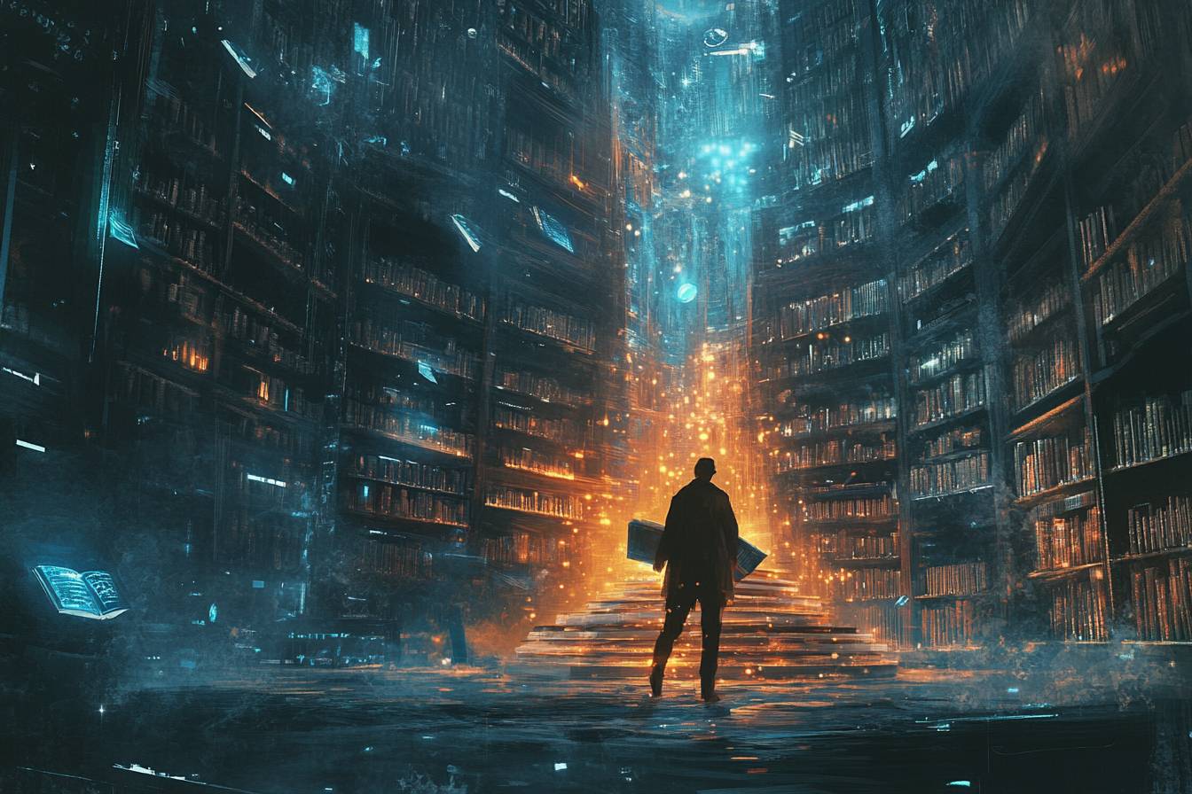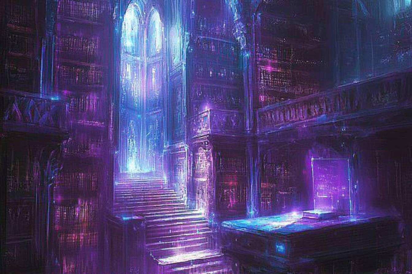 A magical illustration inside a time-warped library, featuring floating books and shifting timelines, glowing in mystical shades.