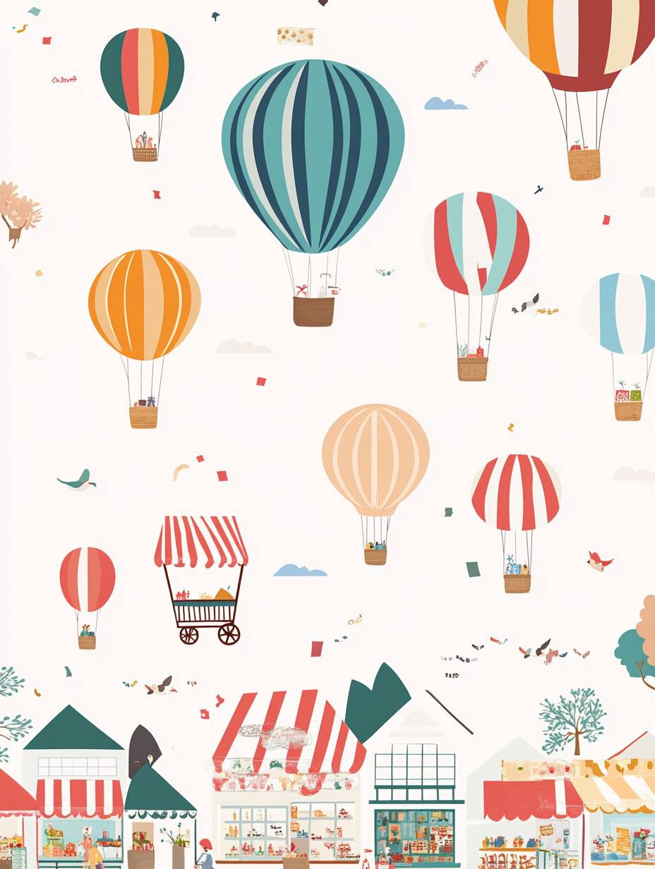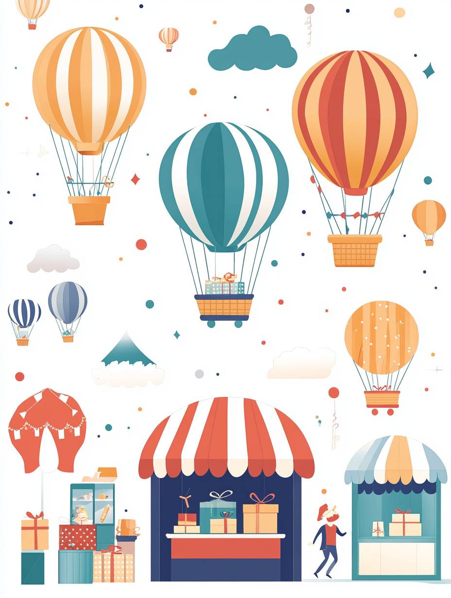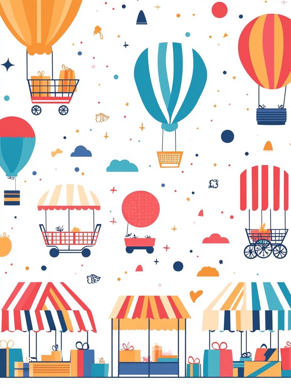 The flat vector background, features hot air balloons, gifts, and shopping carts floating in the sky above an open market stall on white paper with colored lines. , The flat illustration style emphasizes clean shapes and minimalism. , It is simple yet visually appealing for advertising design. --v 6.1 --ar 3:4