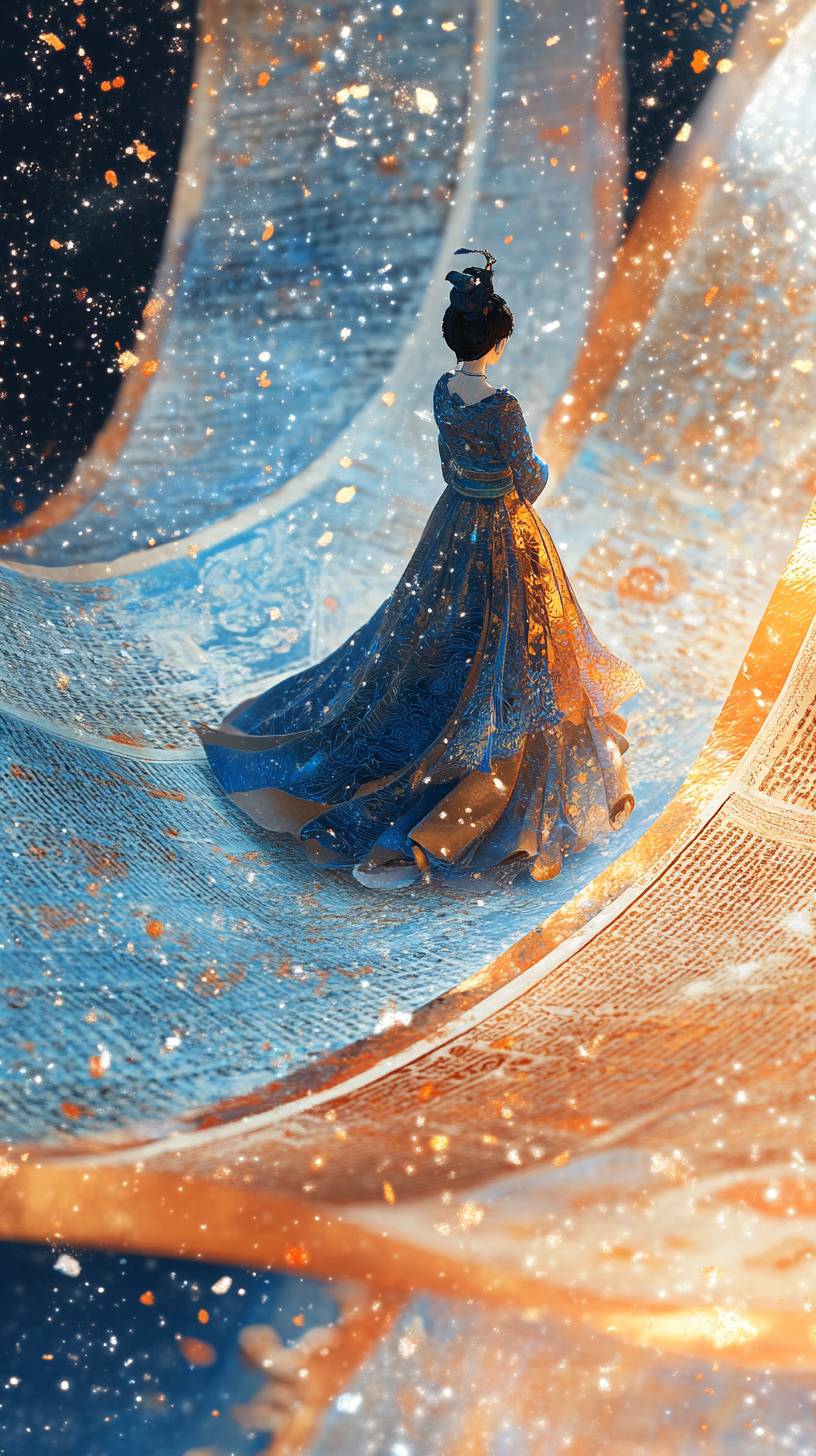 dunhuang art style illustration,blue tones,a tiny mysterious figure with traditional skirt standing onthe long ancient scroll with Buddhist scriptures,zen,the stars are brilliant,dazzling,light and shadow,gradient blue color,blue and orange,super grand sceneswith fluid movements,extremely delicate brushstrokes.soft and smooth,clean background,historical paintings,3d rendering --ar 9:16 --v 6.1