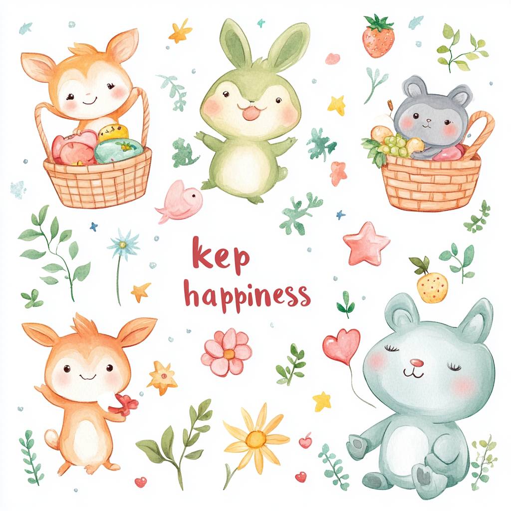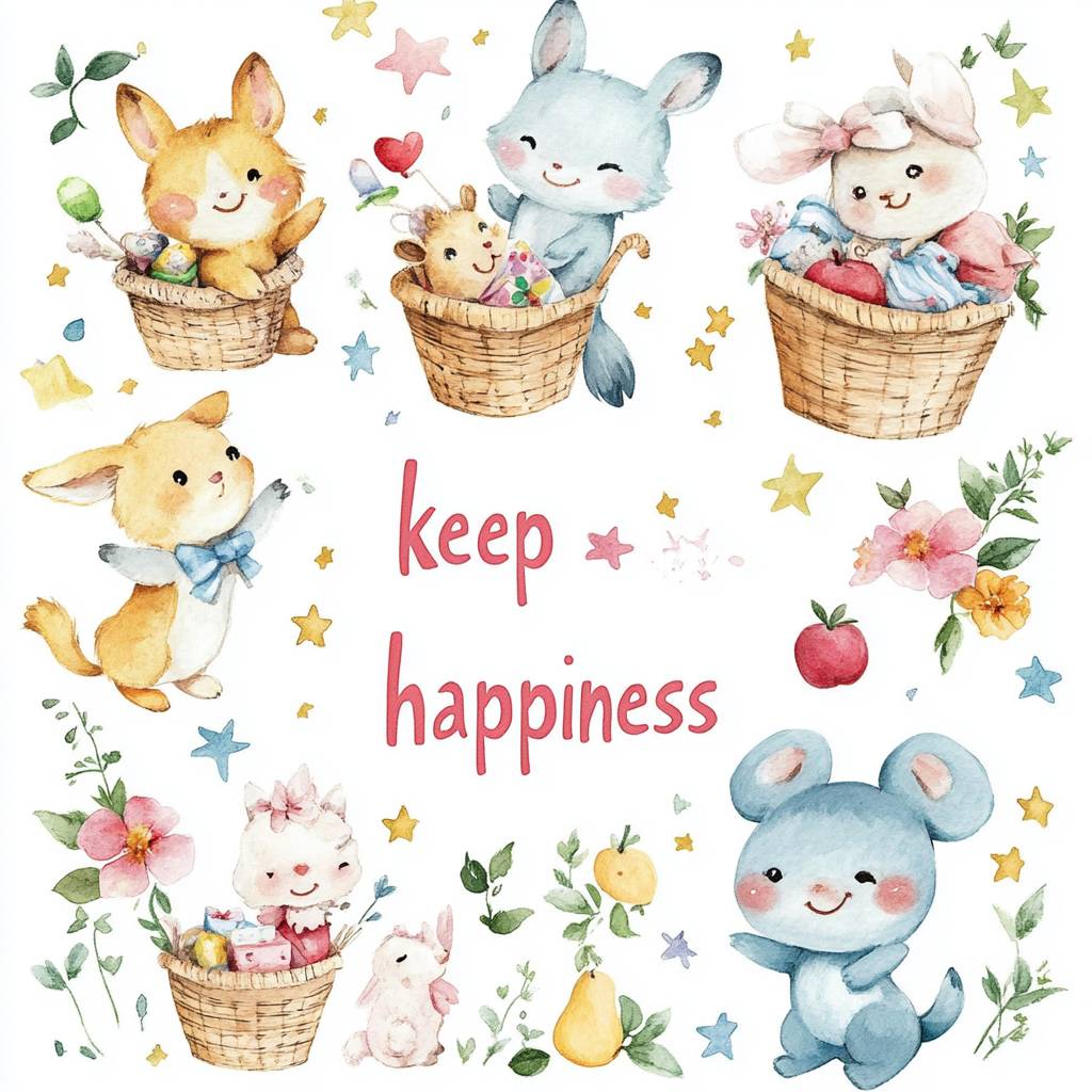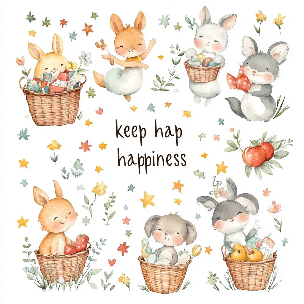 Cute stickers, pastel colors, simple lines and shapes, white background, watercolor style, various animals with baskets of toys on their heads, flowers, fruits, stars around the inscription "keep happiness", cartoon character design sheet, white border.