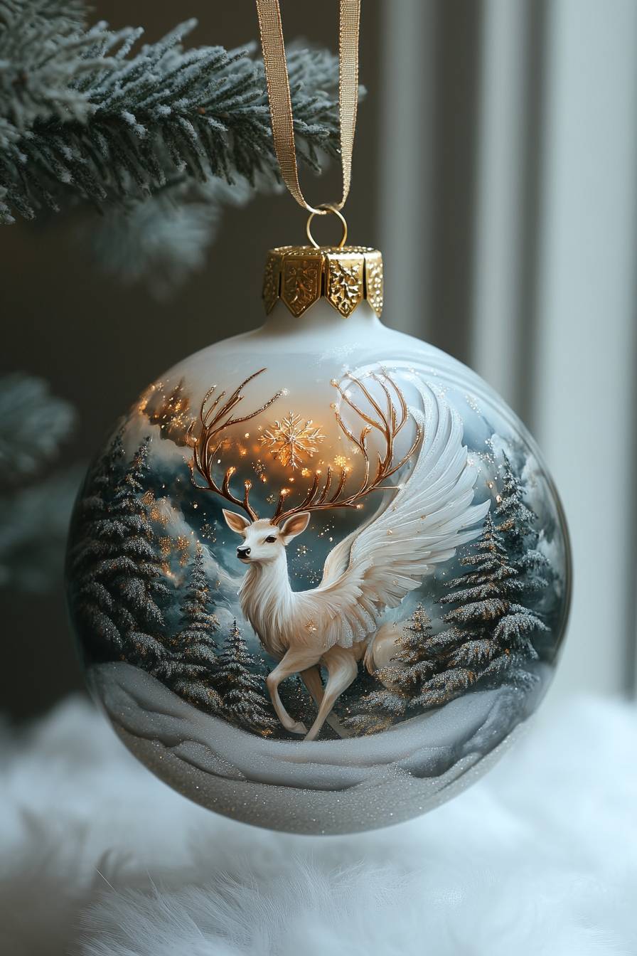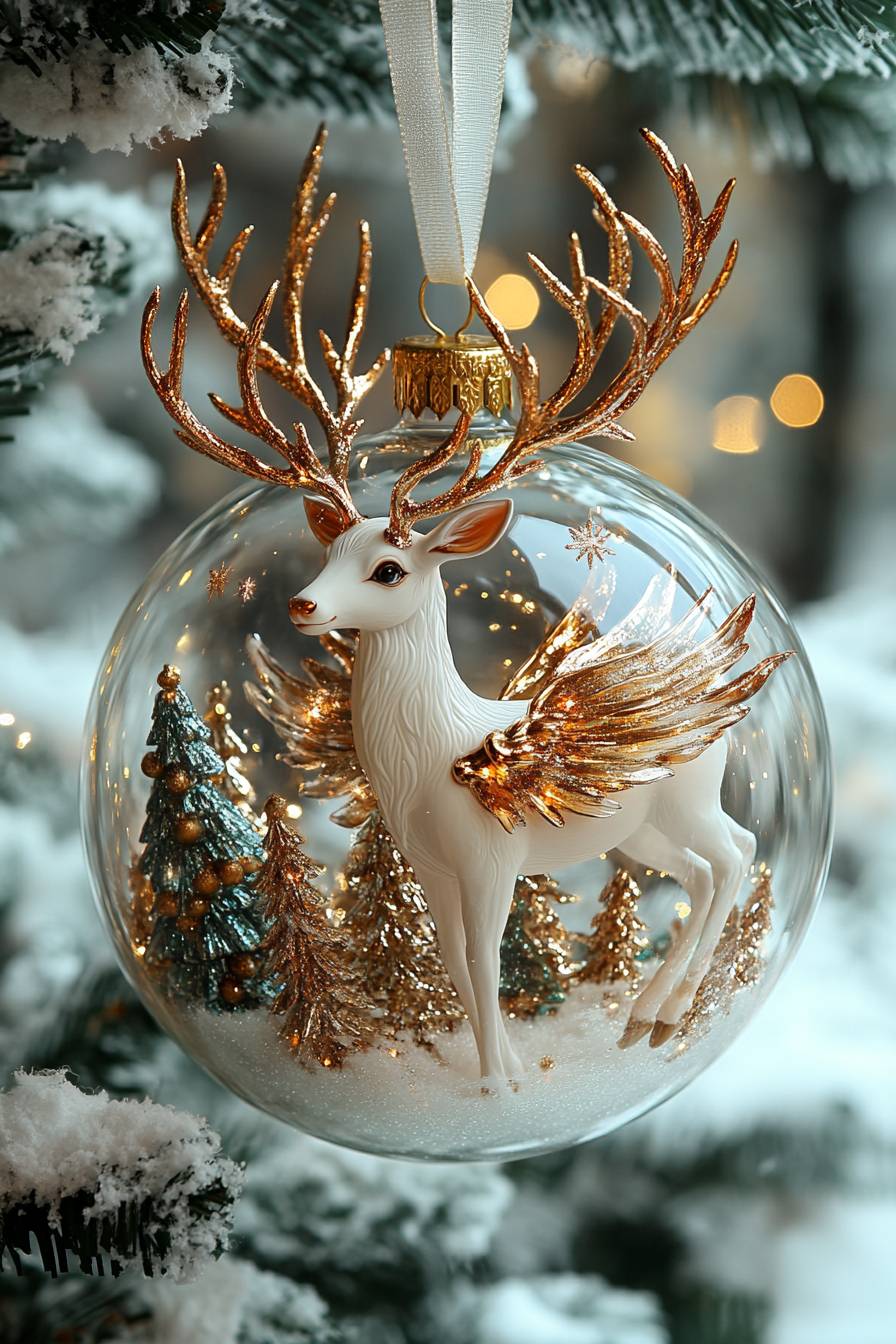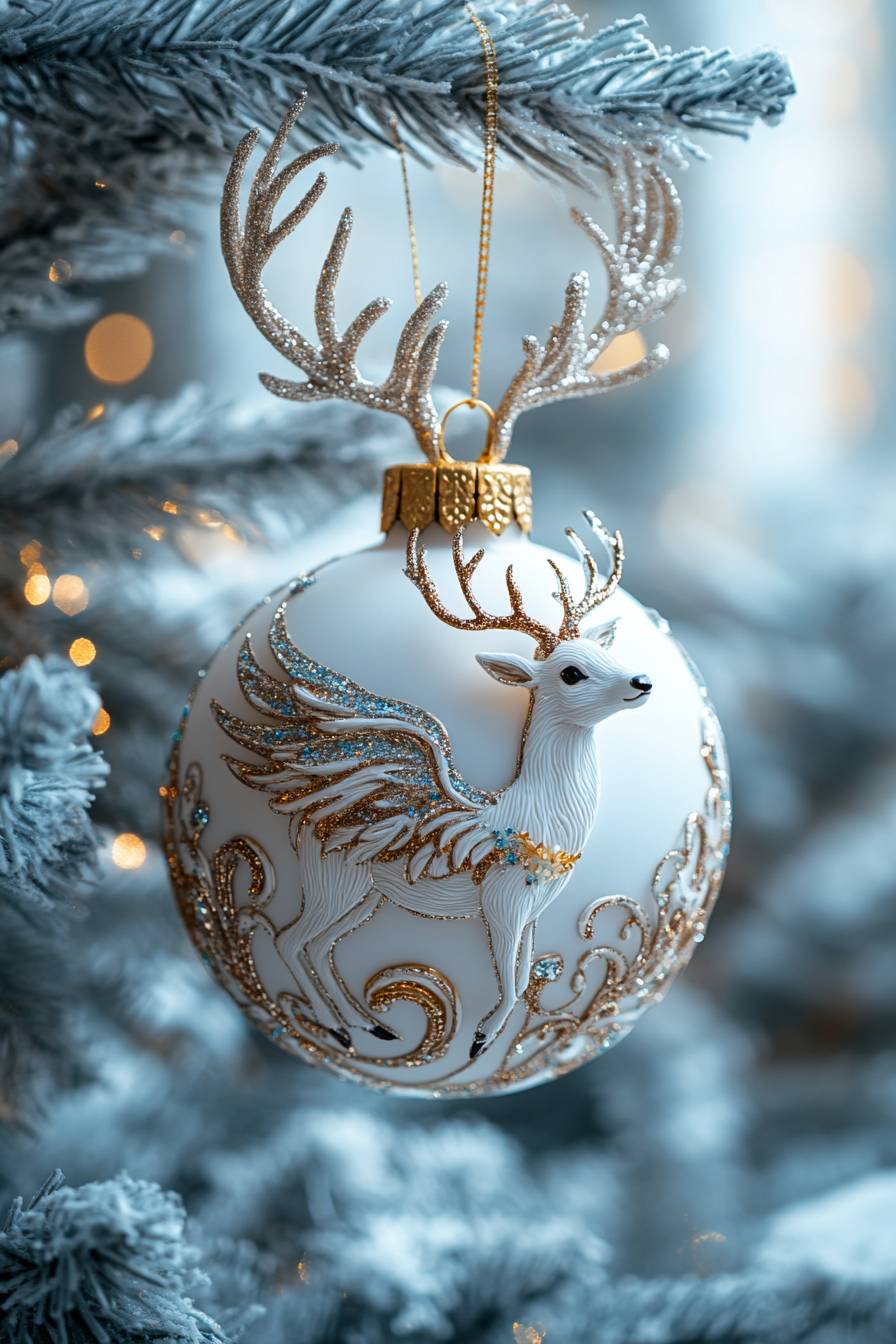 A Christmas tree ball hanging on a ribbon contains a white magical deer with sparkling wings, set against a white background in high resolution.