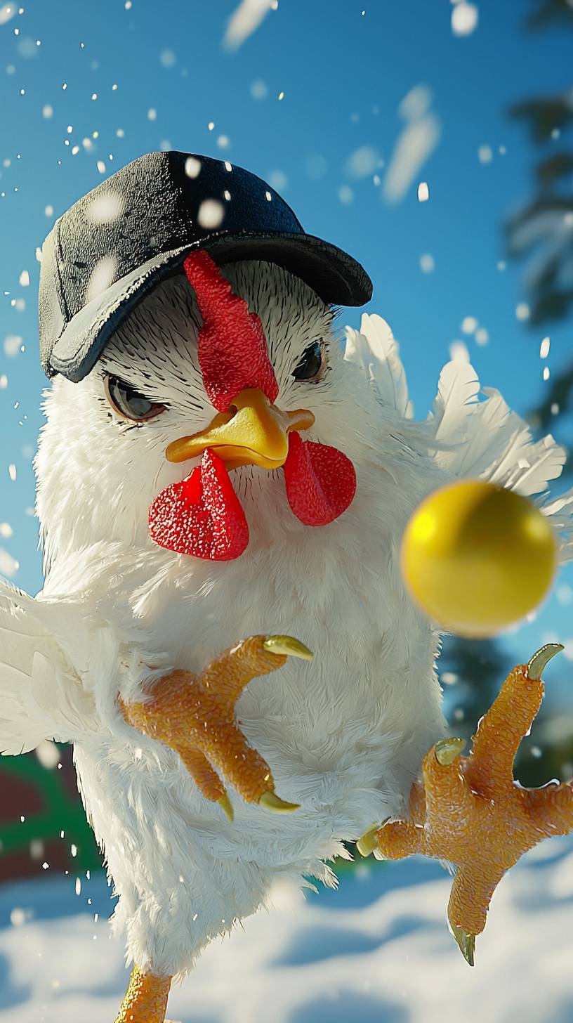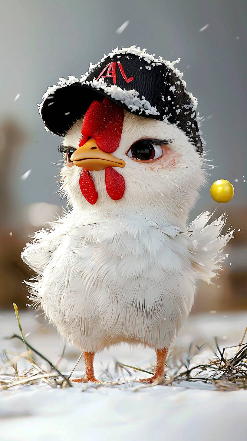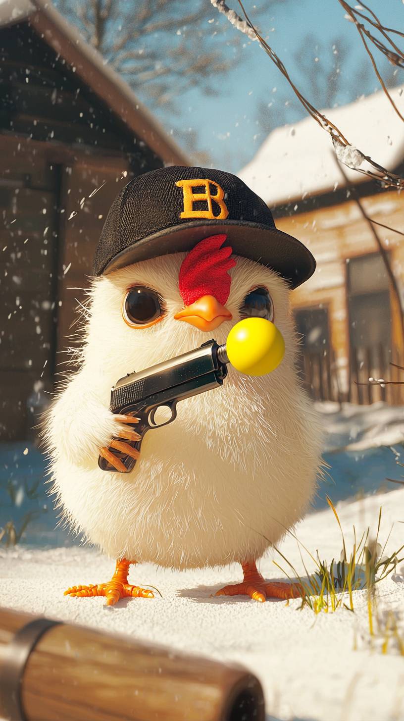 a small white chicken with red head and black baseball cap, getting hit by a projectile . Hurted face . Yellow pistol ball projectil on face. with farm background. Winter weather with daylight. Cartoon artwork style. Detailed. Realistic. --ar 9:16 --quality 2 --stylize 50 --v 6.1