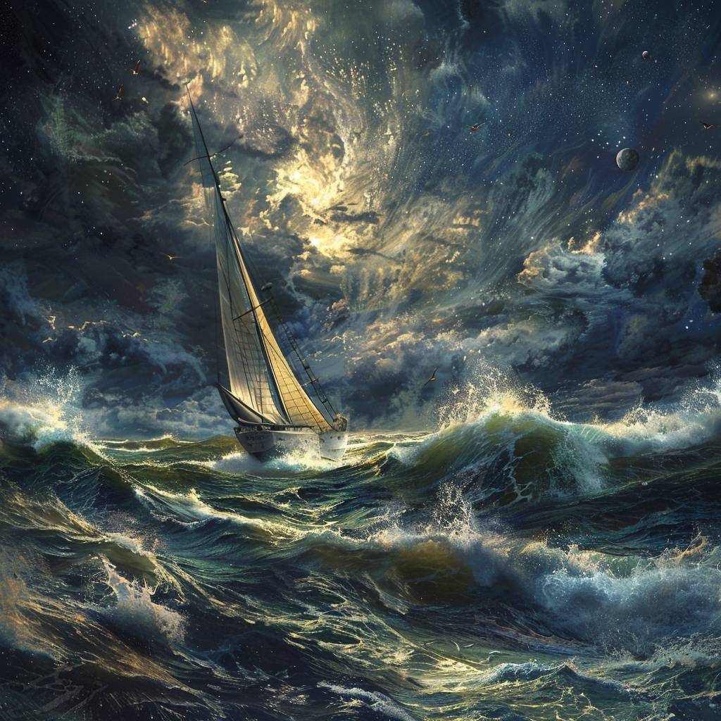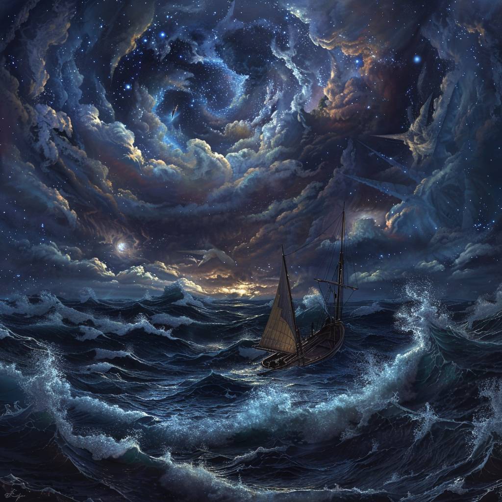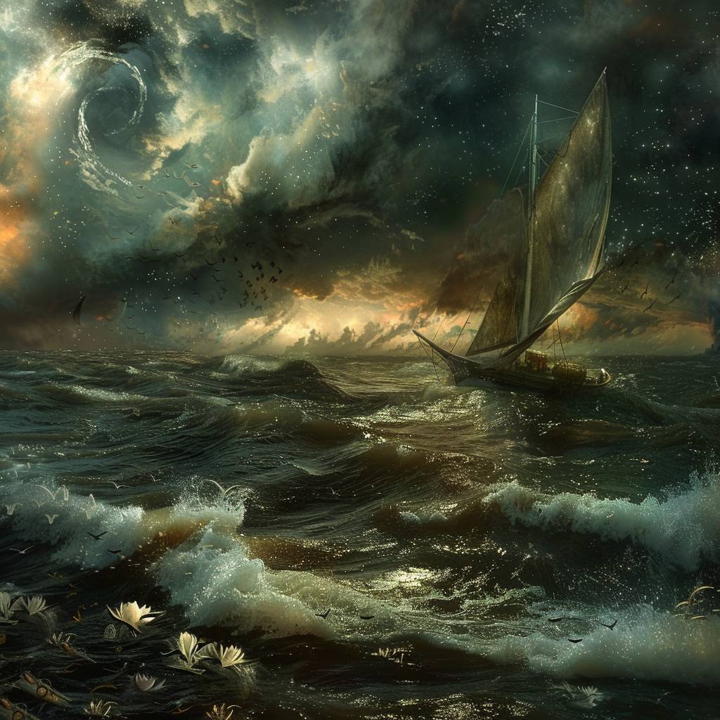 A real photographic landscape painting with unmatched reality, depicting a super wide scene, ominous sky, sailing boat, wooden boat, lotus, huge waves, starry night, volumetric lighting, and realistic style inspired by James Gurney and ArtStation.