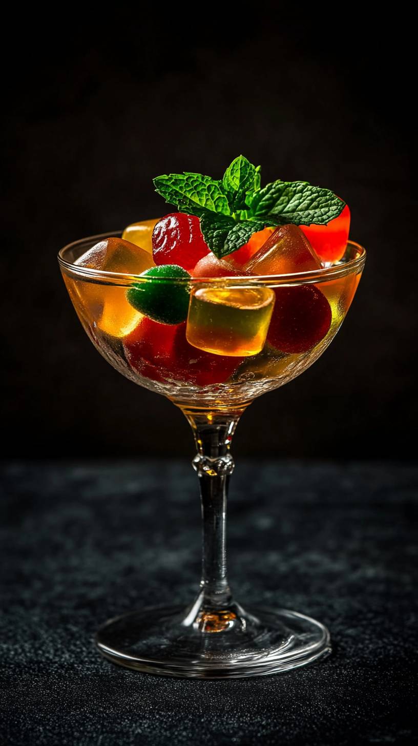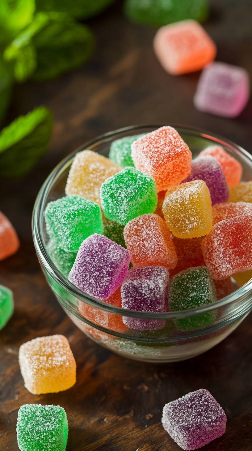 Colorful sweet gummy candies with mint garnish.