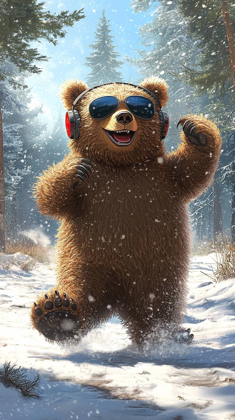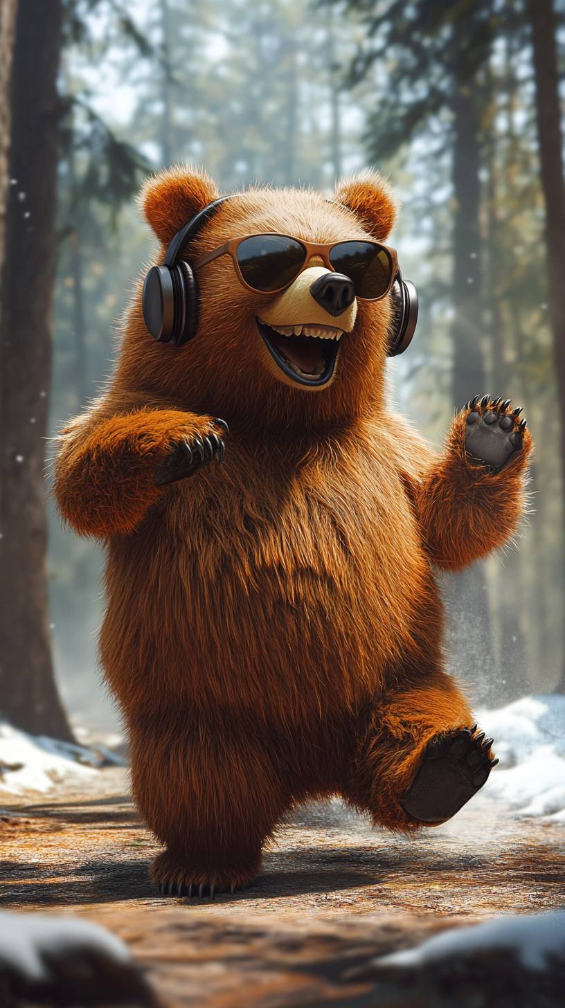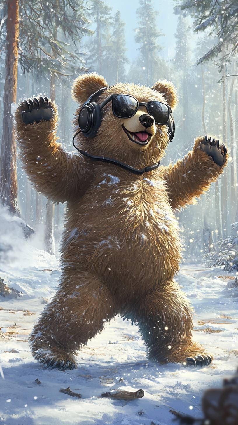 A large, cartoon bear with headphones, dancing energetically and clumsily, wearing sunglasses, in a forest clearing, with a big smile on its face, winter time --ar 9:16 --v 6.1