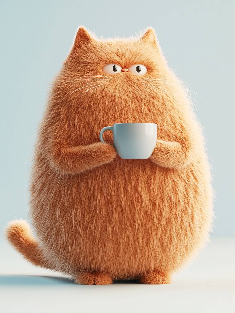 A lovely, chubby, and furry cat is covered all over with a layer of soft and thick fur. The cat is holding a coffee cup, with a cute expression, furry texture, bleary-eyed, and looks sleepy. High-definition wallpaper with a solid color background, simple design, and high resolution. The furry texture is in Pixar style, super fluffy plush style. A masterpiece with high detail and best quality. It is a beautiful plush creation. In 3D, the furry style is simulated by Blender and C4D. The scene is simple and minimalist. Shot with a Canon camera and studio lighting.
