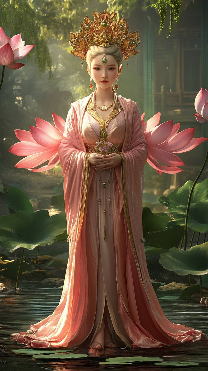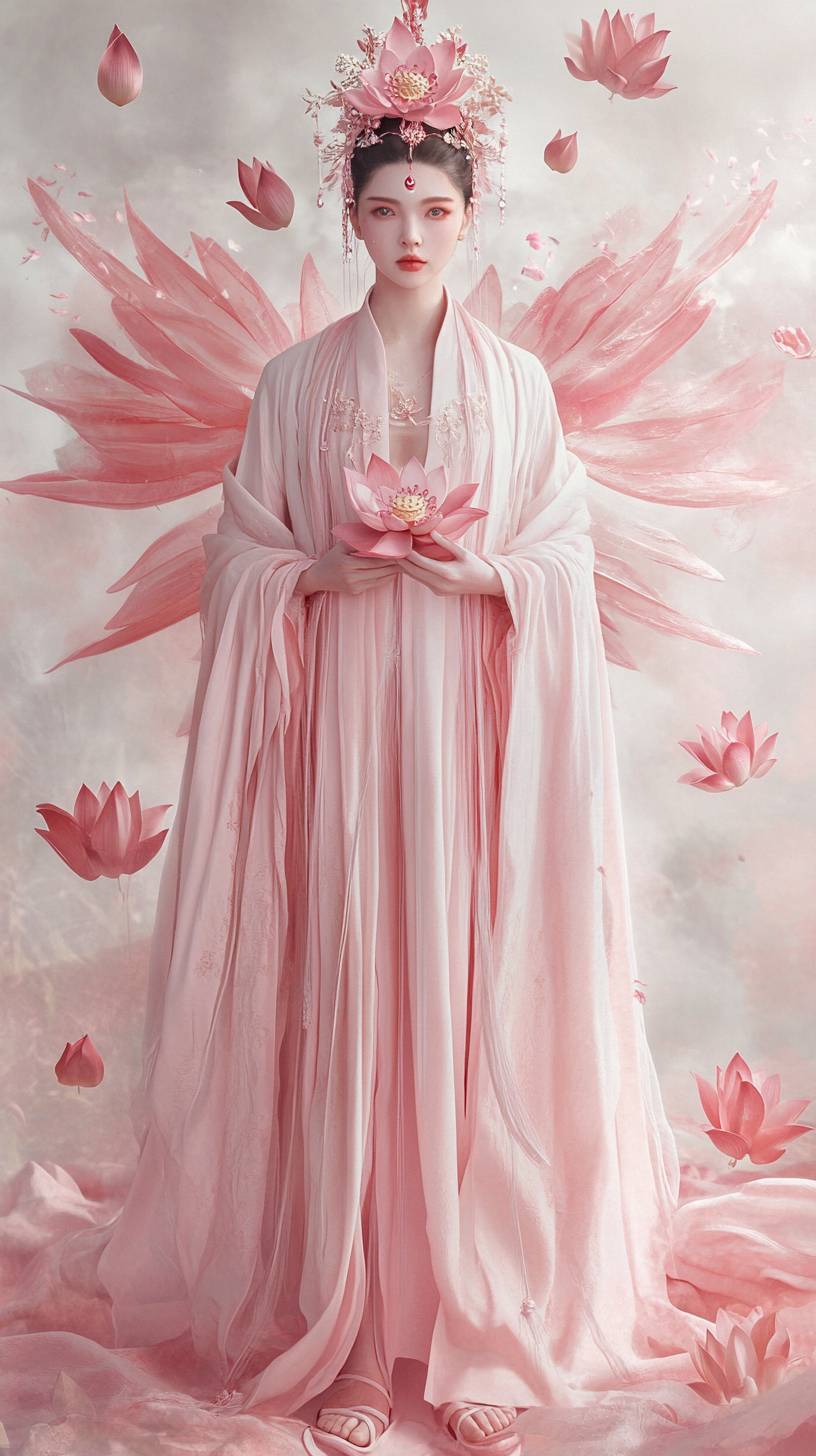 Movie poster,(movie texture :1.5), full-body makeup photo of movie characters,(full-body photo :1.5),(Panorama),27years old, bright lotus goddess, fairy transformed by lotus, Oriental atmosphere Asian face,(skin pores and texture clear: 2), wearing a flowing pink robe,(with lotus leaf embroidery on the sleeves), 2 pink lotus flowers on the skirt, casual standing posture, pink shoes, headdress is a lotus shaped tulle, ancient beauty bun, 32k, Chinese Xiexia style, Ultra HD, high resolution photography, movie lighting, movie stilts,UE5 render,oc render, natural light, Dopamine style, little fresh, clean background --ar 9:16 --v 6.1