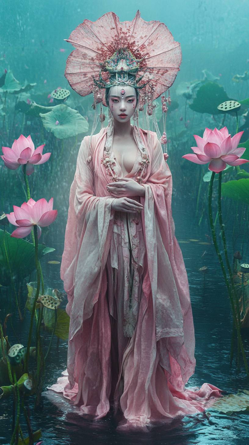 A full-body makeup photo of a 27-year-old lotus goddess.