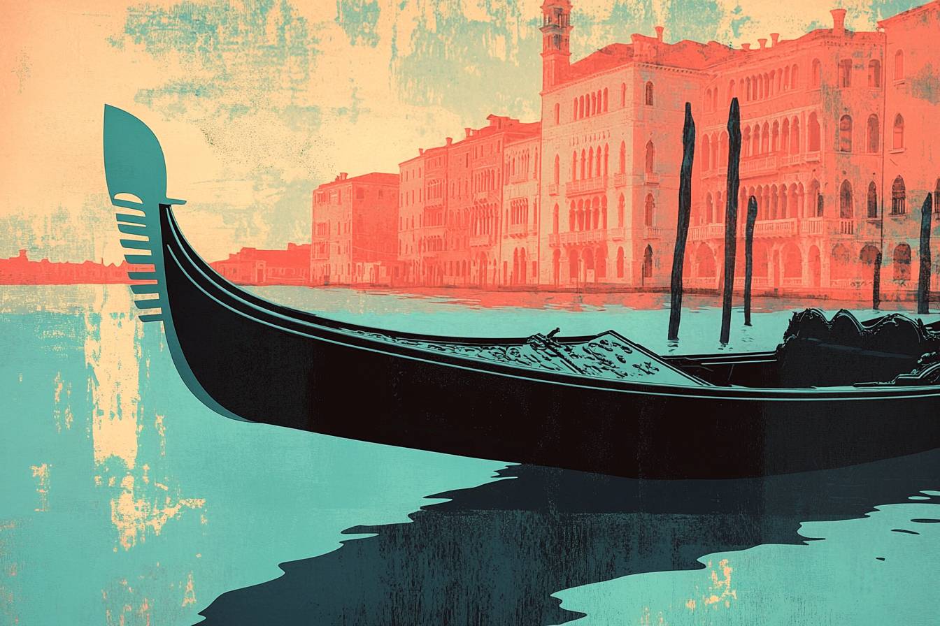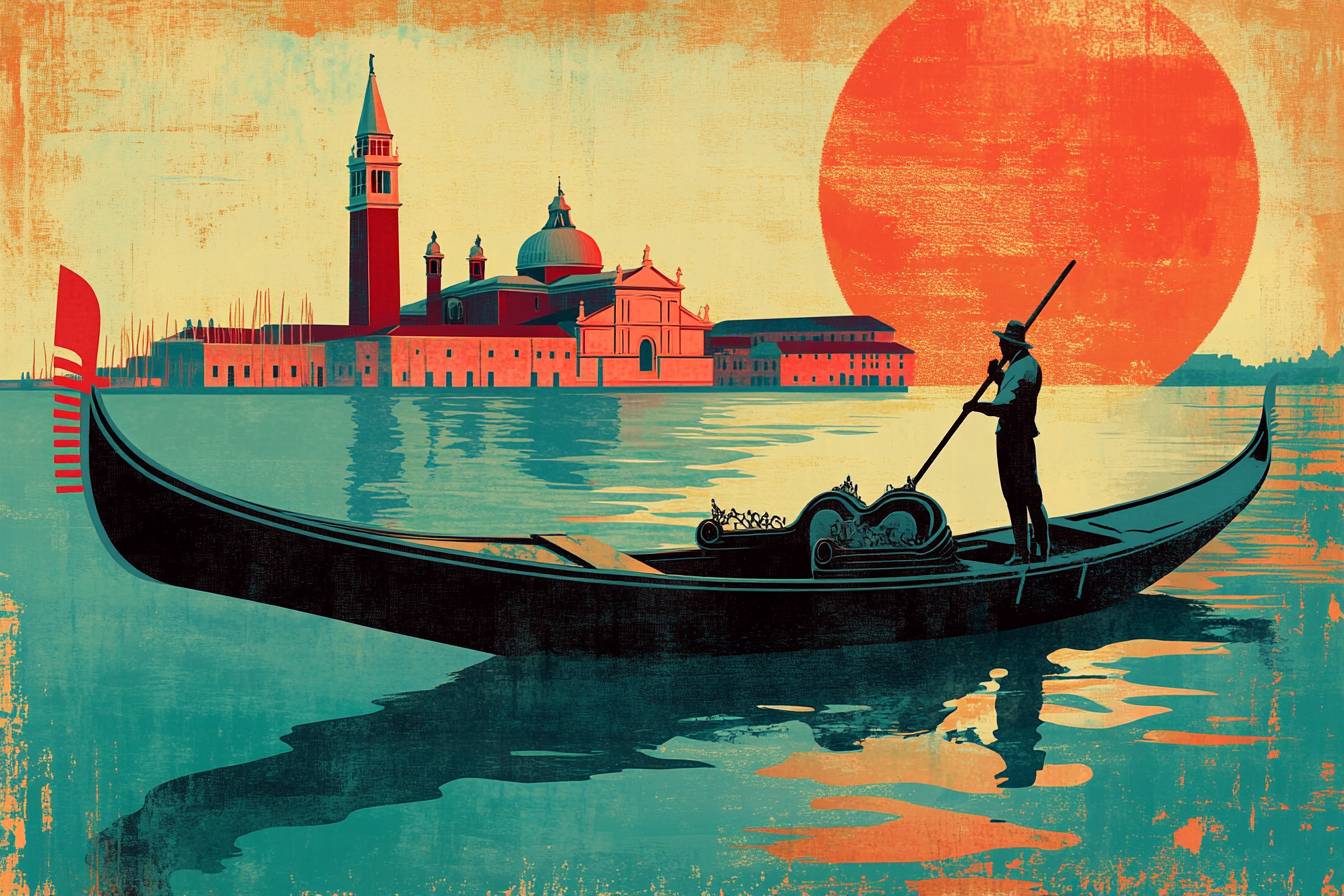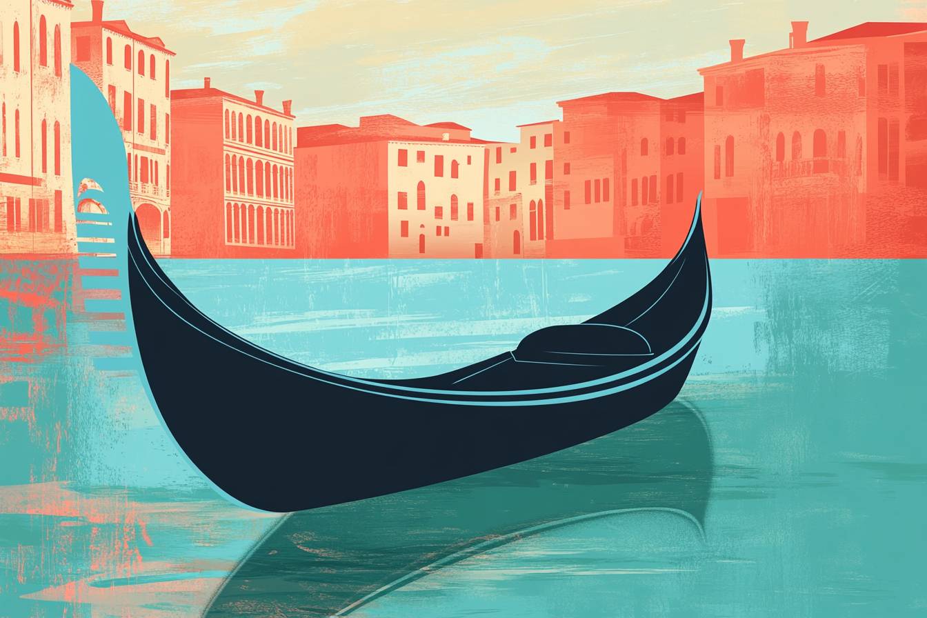A vintage travel postcard illustration of a Venetian gondola, capturing the charm of iconic destinations with stylized graphics. Using vibrant teal and coral tones to celebrate the joy of travel in a bygone era.