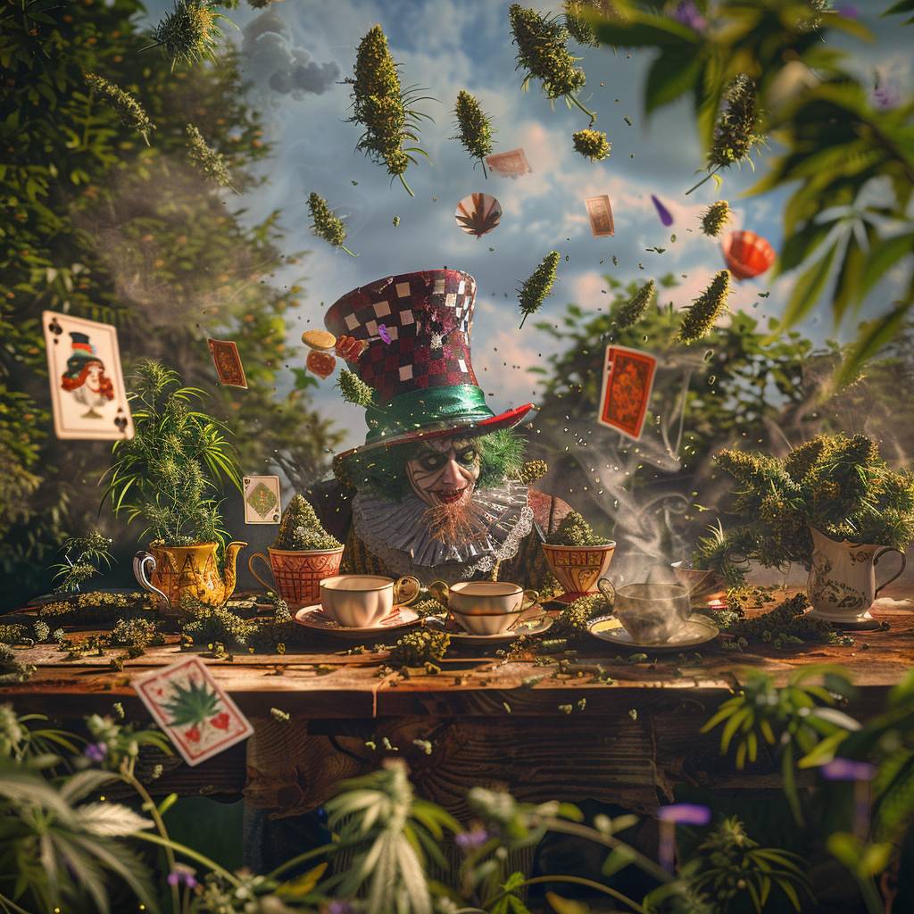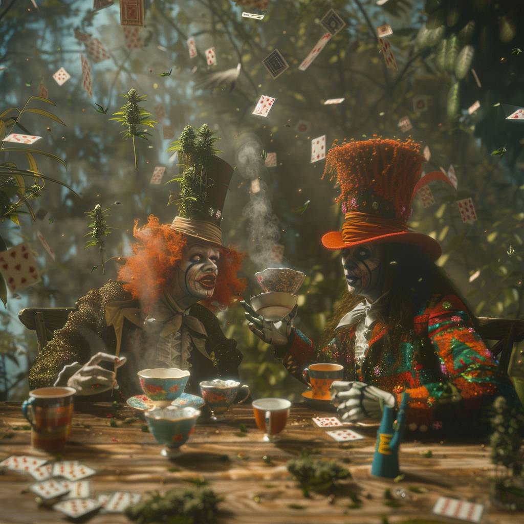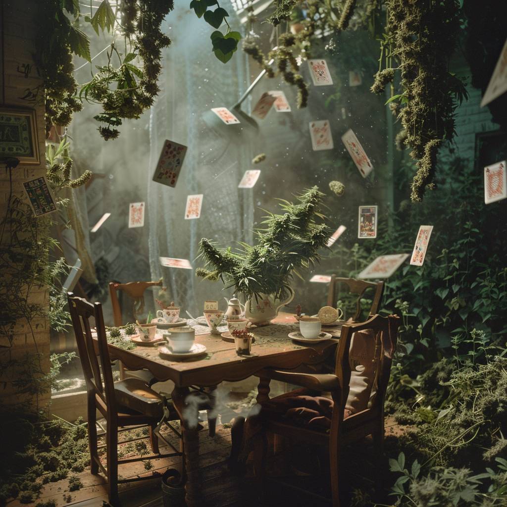 Hyper detailed movie still that fuses the iconic tea party scene from Alice in Wonderland showing the hatter and an adult alice. a wooden table is filled with teacups and cannabis plants. The scene is surrounded by flying weed. Some playcards flying around in the air. Captured with a Hasselblad medium format camera. –ar 3:2 --v 6.0