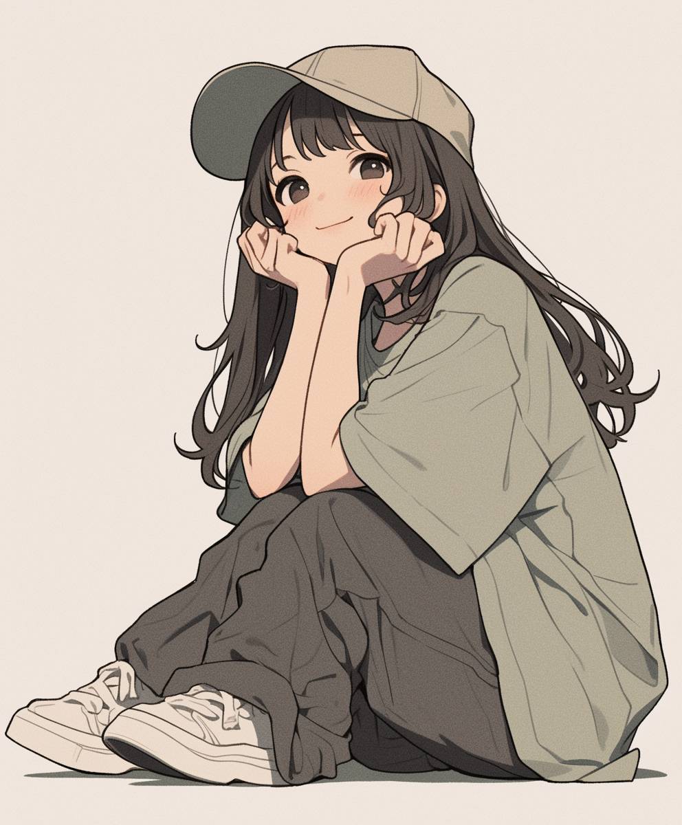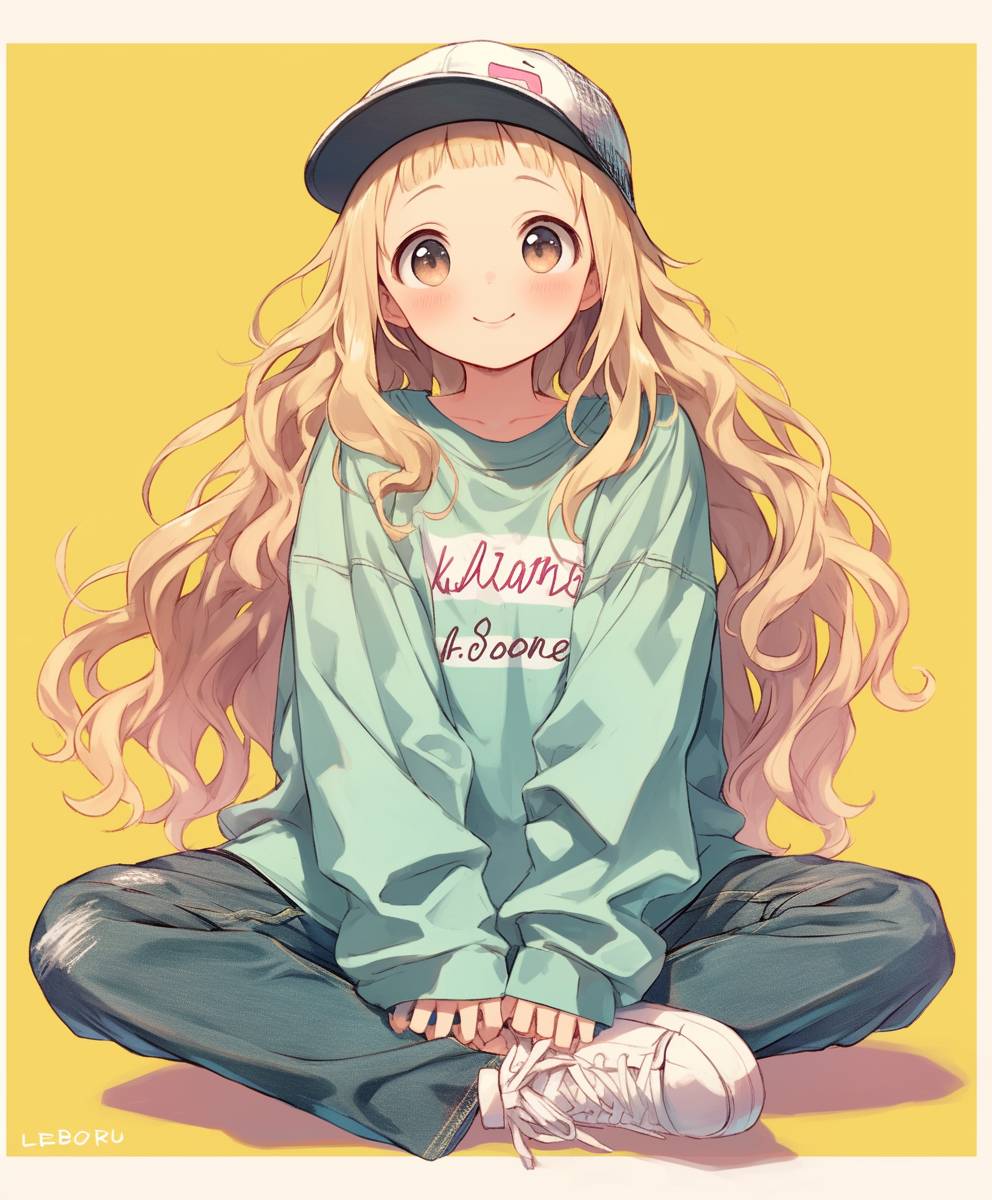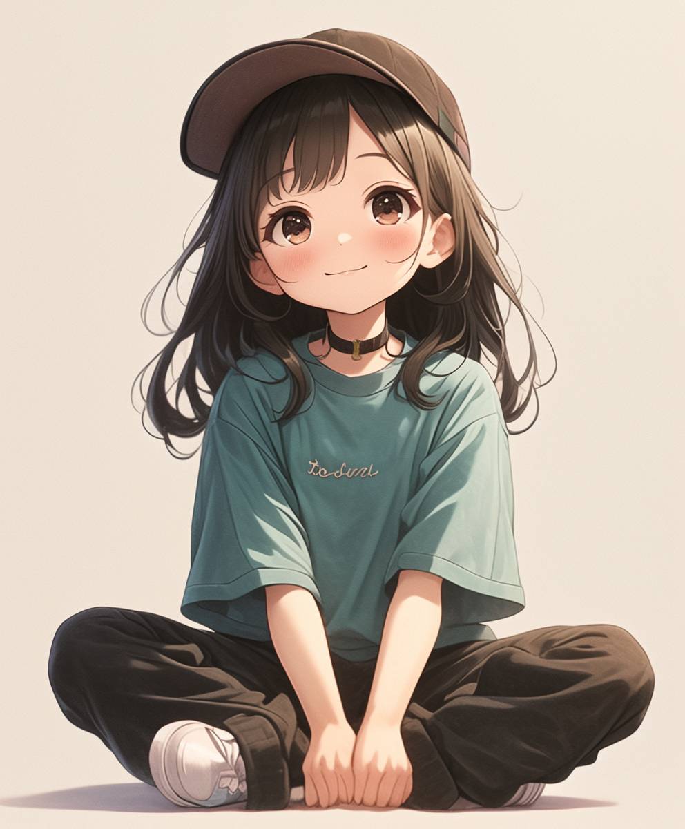 Cute little girl wearing a cap, with long hair and bangs, and brown eyes, a cute smile, and big white shoes. Full-body portrait against a simple background, wearing light green casual and dark pants, sitting on the ground. In the style of anime. --ar 92:111 --stylize 600 --niji 6