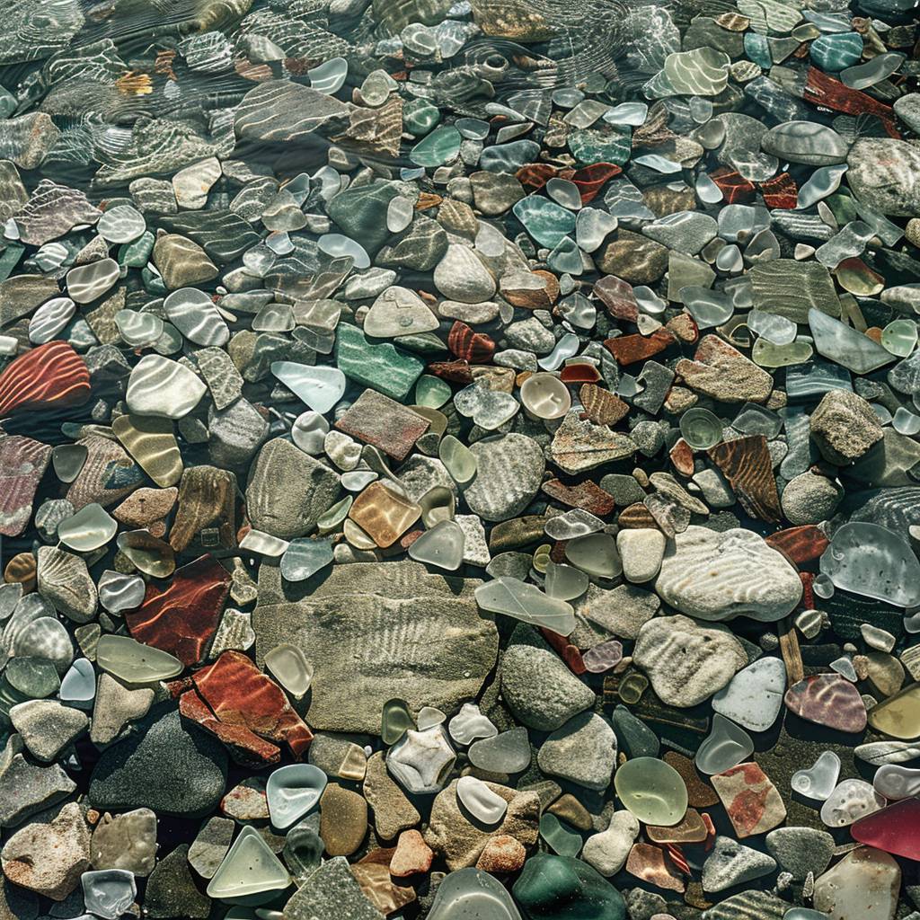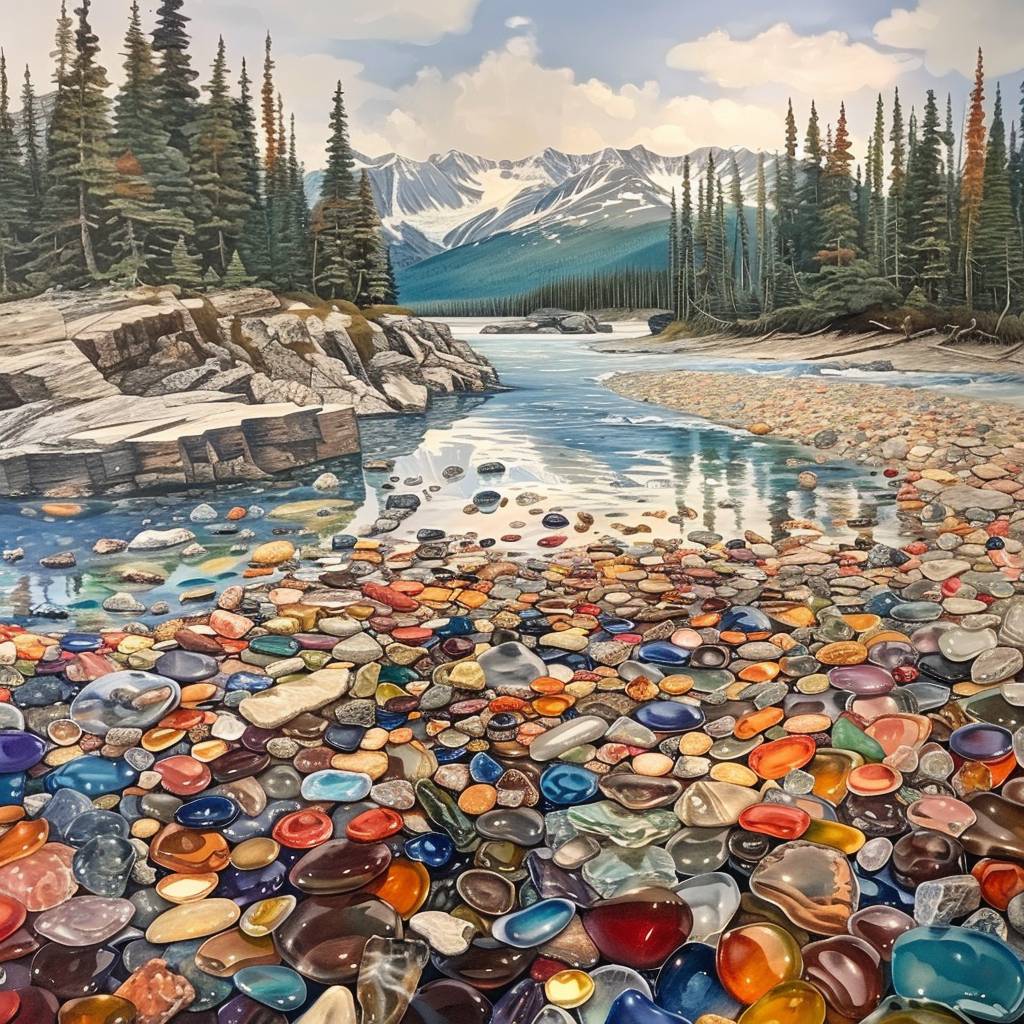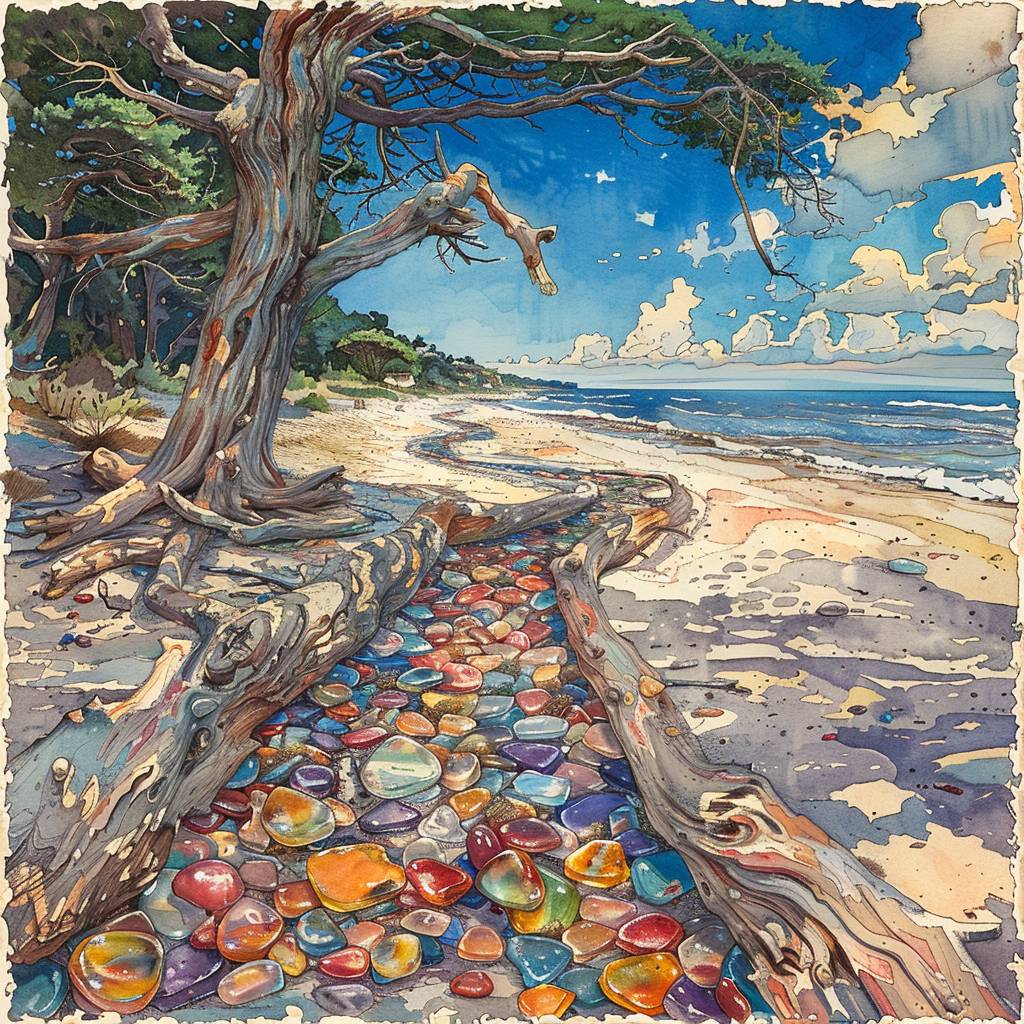 A naturalistic landscape of sea glass featuring a lake and woodlands, drawn in color pencil.