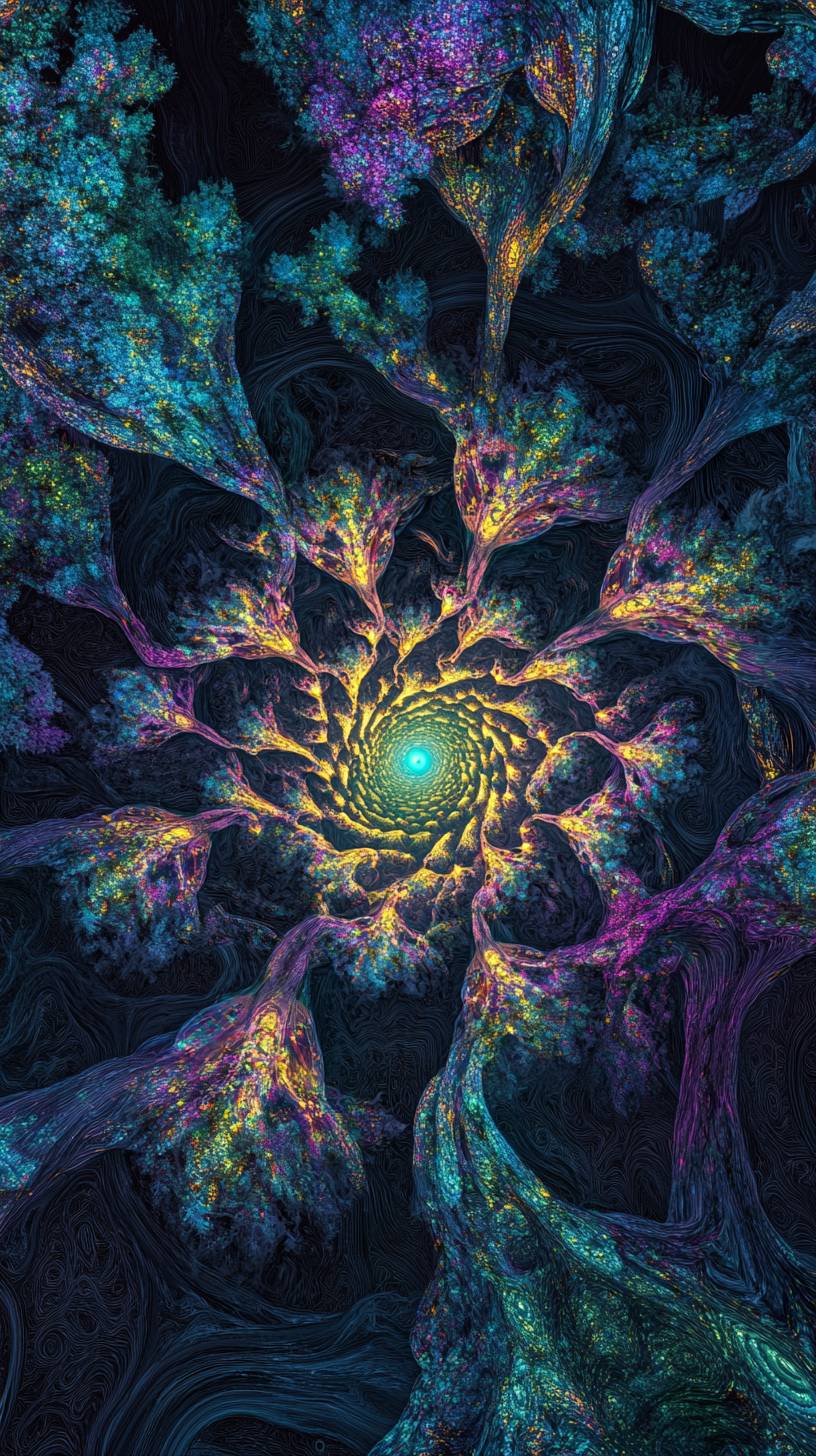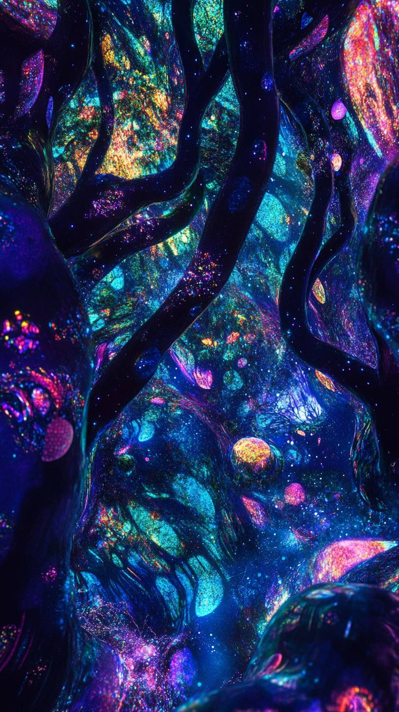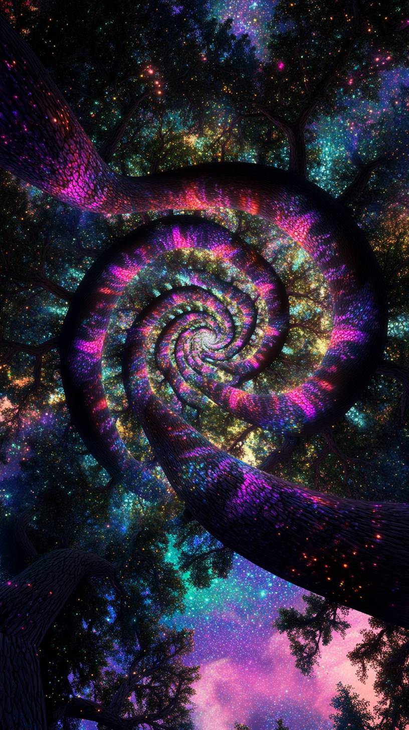 top down photograph a infinitely recursive, rotating forest, illuminated by the dense tree canopies made of neon dichroic chromatic opalescent Aurora-glitter glowsparkles, enhance the otherworldly Aurora borealis effect, casting eerie, shifting lights on their forms. The vortex’s psychedelic patchwork black and neon chromatic chrome floam stripes twist and turn around, creating a dynamic, mesmerizing backdrop. Abstract shapes, such as tangled spheres, pyramids, and Möbius strips adorned with flowing patterns, contributing to the surreal ambiance. --ar 9:16 --v 6.1