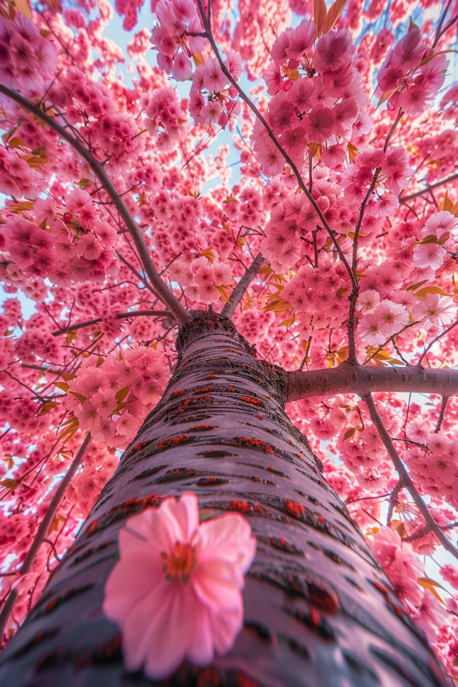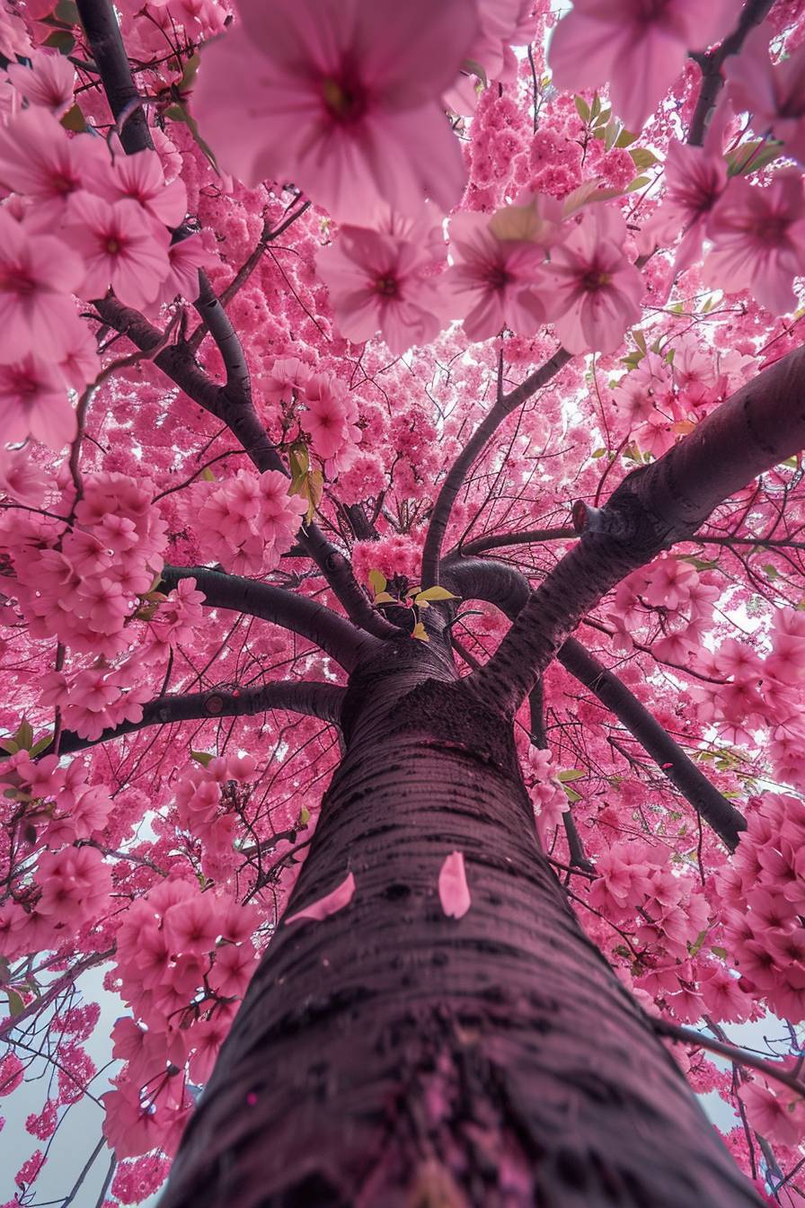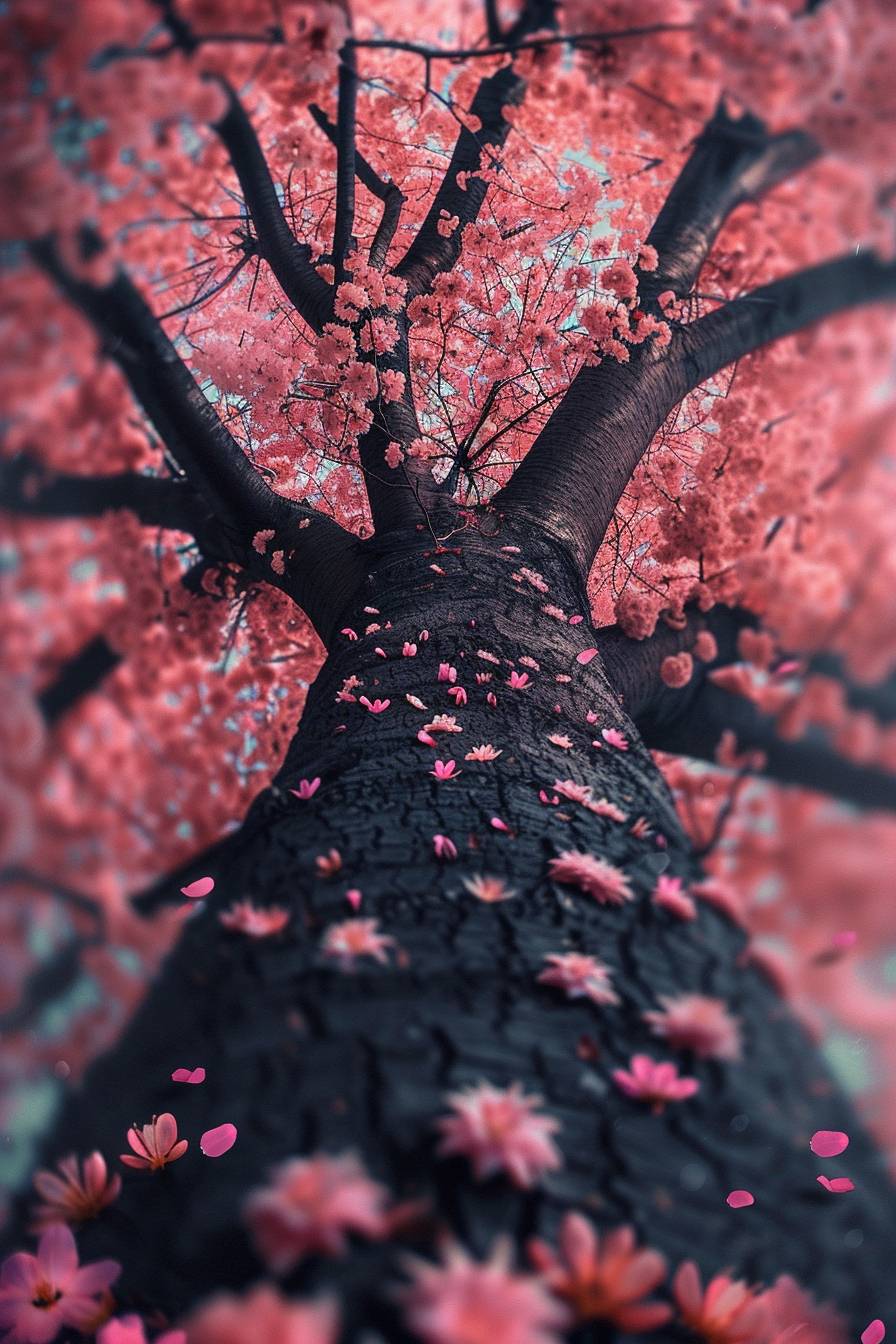 bottom view of cherry blossom tree, pink flowers falling slowly, color vibrant, pink color palette --ar 2:3 --v 6.0