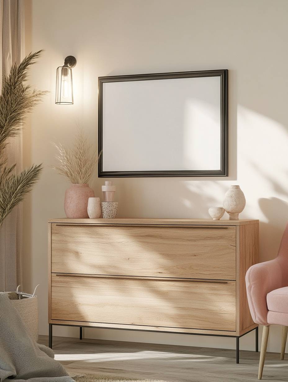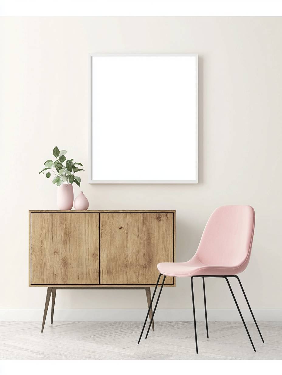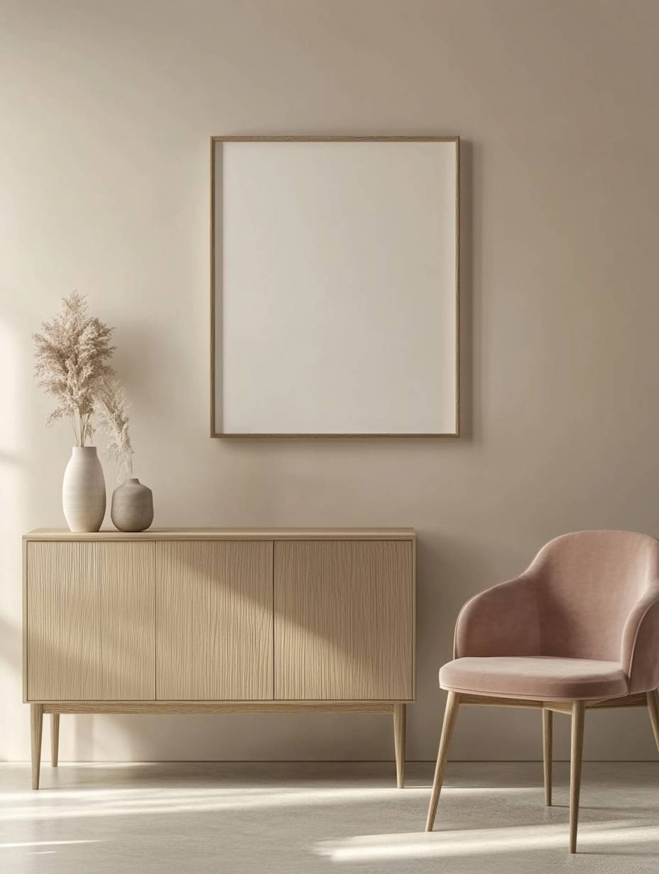 Remove chair from the image. A realistic close-up of a Scandinavian-style sideboard made of light oak, against a soft cream wall. An empty white frame hangs above the sideboard with no objects in front of it to obscure the view. A blush pink accent chair with clean, modern lines sits nearby, adding a touch of elegance. On the far edge of the sideboard, a small ceramic vase and a minimal potted plant add subtle detail without drawing attention from the blank frame. High-quality photography, natural soft shadows, realistic lighting. --chaos 30 --ar 3:4 --style raw --v 6.1