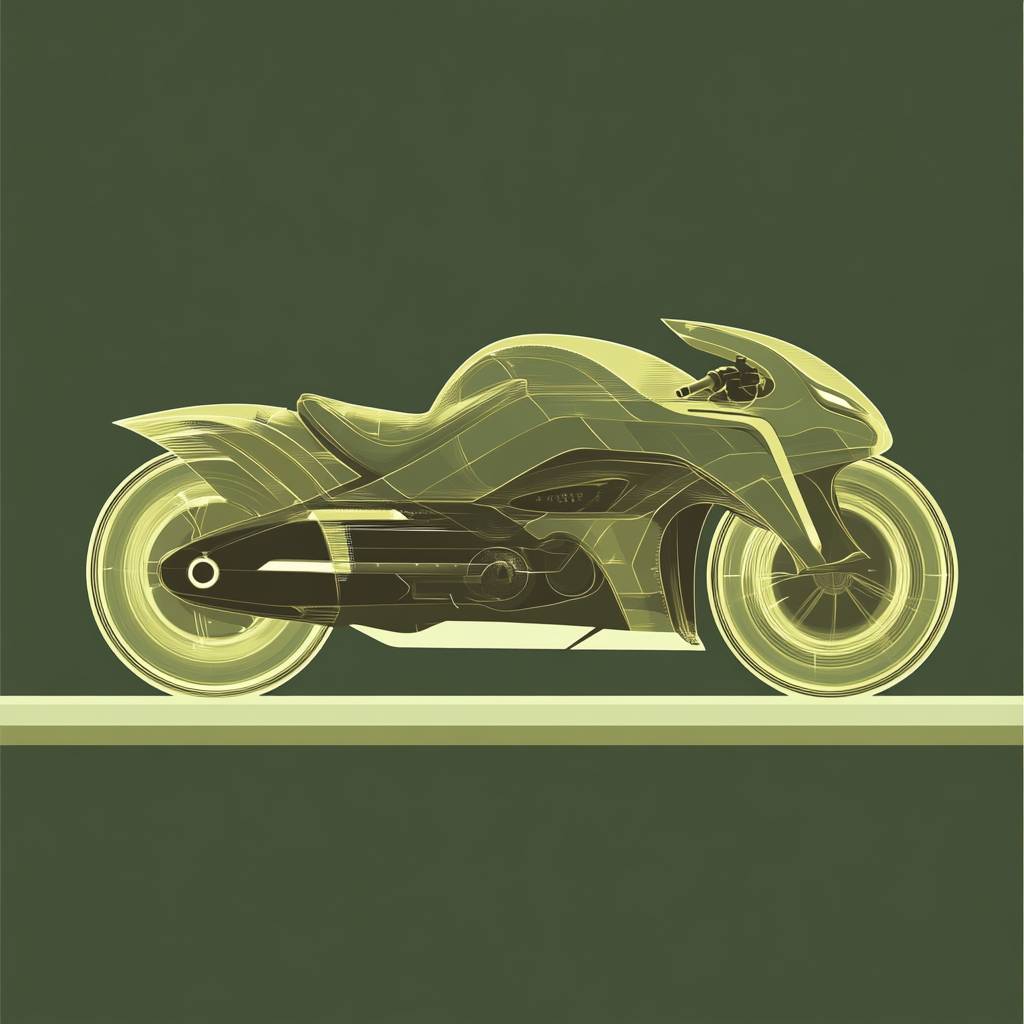 A vector artwork of the futuristic motorcycle from Tron in a watermark elegance style. The bike is subtly embedded into the design with soft, flowing cream lines that give it an ethereal, elegant look. The details, such as the glowing light trails and futuristic details, are delicately outlined, while the rest fades softly into the background. The olive green background adds a sense of depth, allowing the cream lines to blend seamlessly for a smooth, high-end visual.
