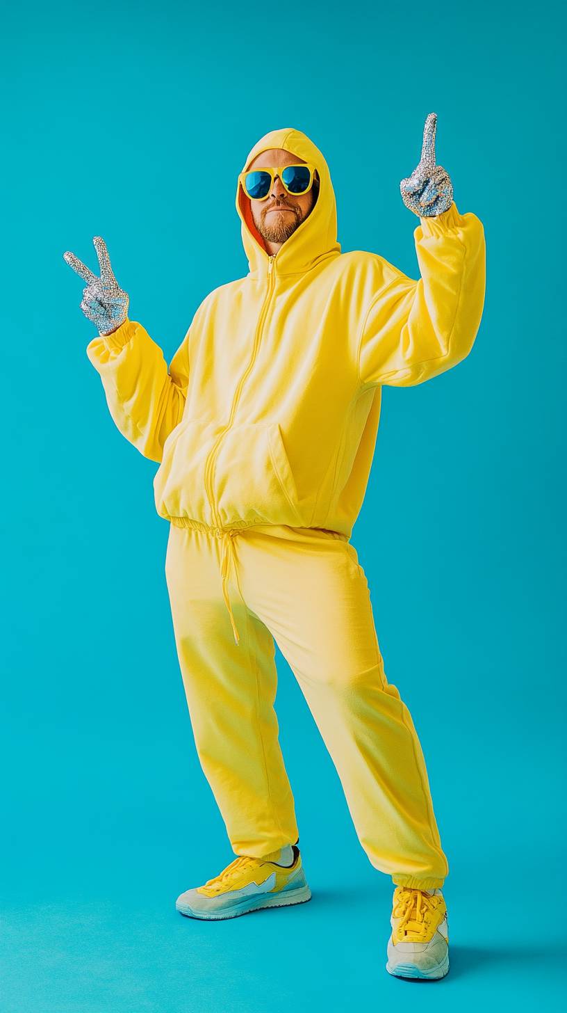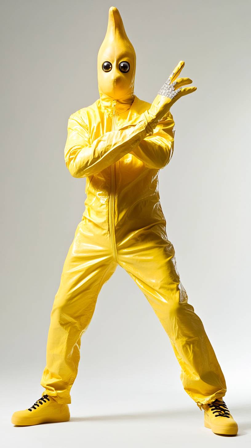 Banana man showing his diamond hands to the camera while standing like a host from an 80s TV show in the style of a 24mm photo.