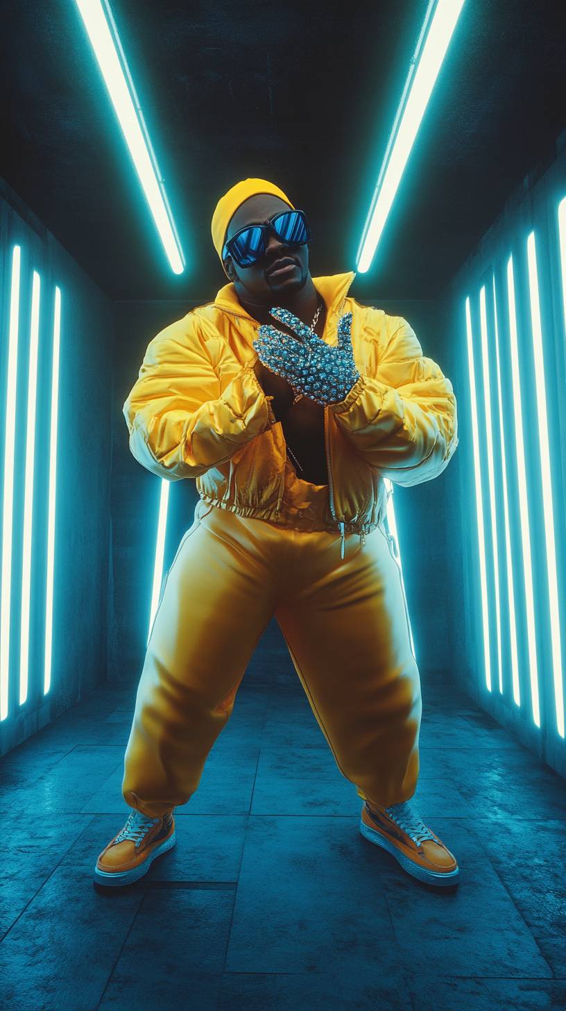 banana man showing his diamond hands to the camera while standing like a host from an 80s tv show in the style of photo 24mm --ar 9:16 --v 6.1