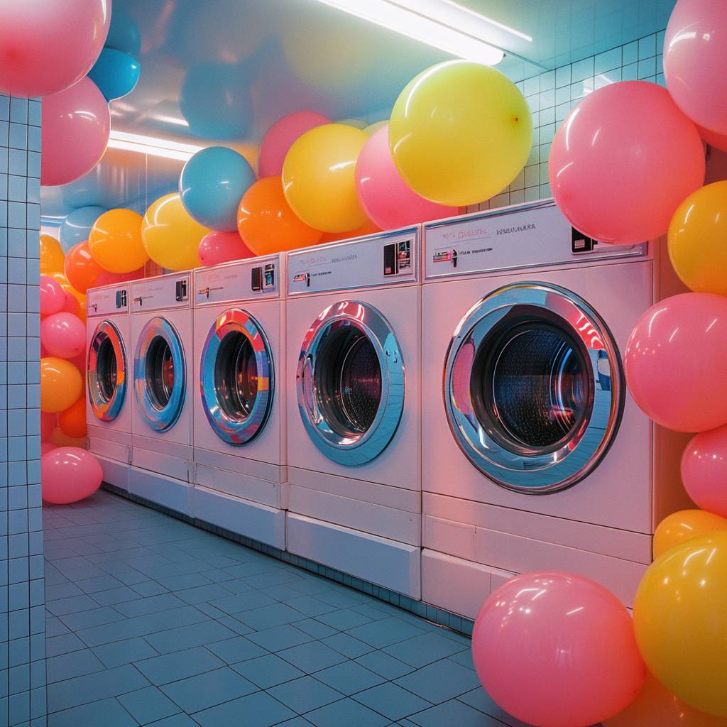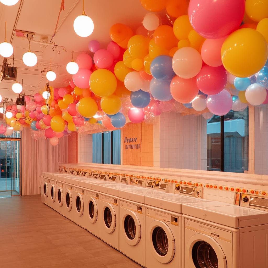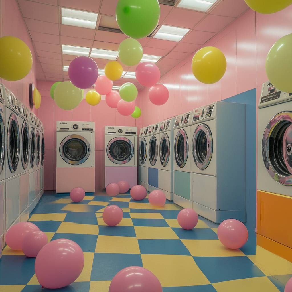 A laundromat designed by Virgil Abloh with a lot of balloons around for a video shoot