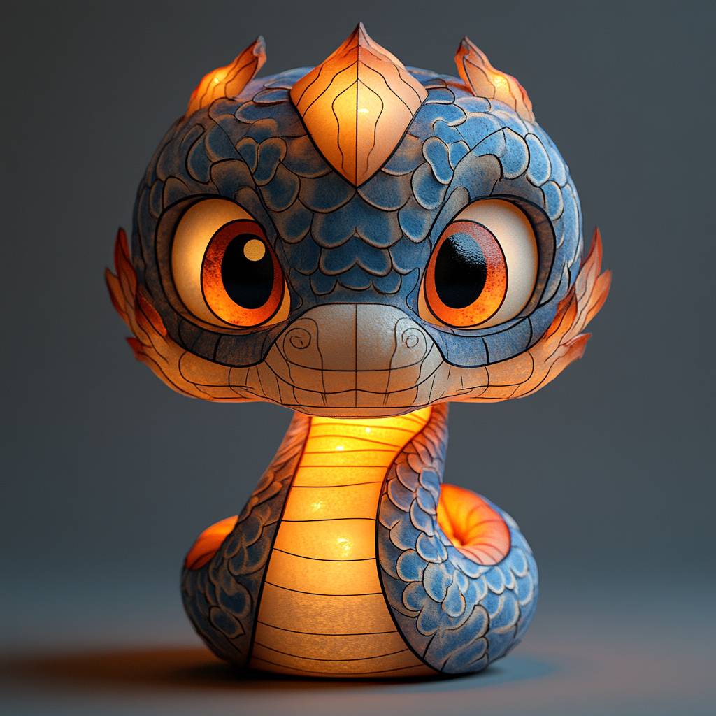Snake head-shaped lantern, cartoon style, Q version, red, yellow, blue and white color matching, with lights inside. The frame is vaguely visible, with a simple structure. Festive and solemn. High details, super quality, wide-angle lens, 8k, --stylize 750 --v 6.1