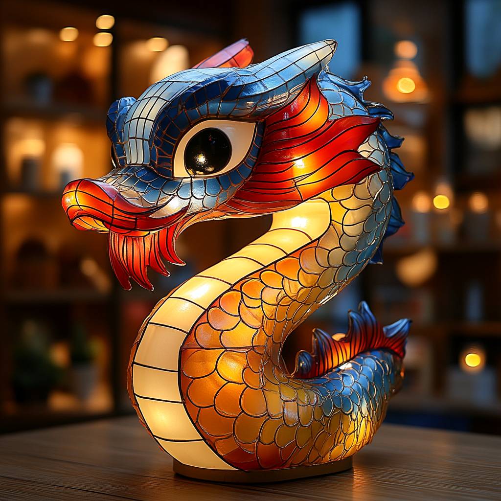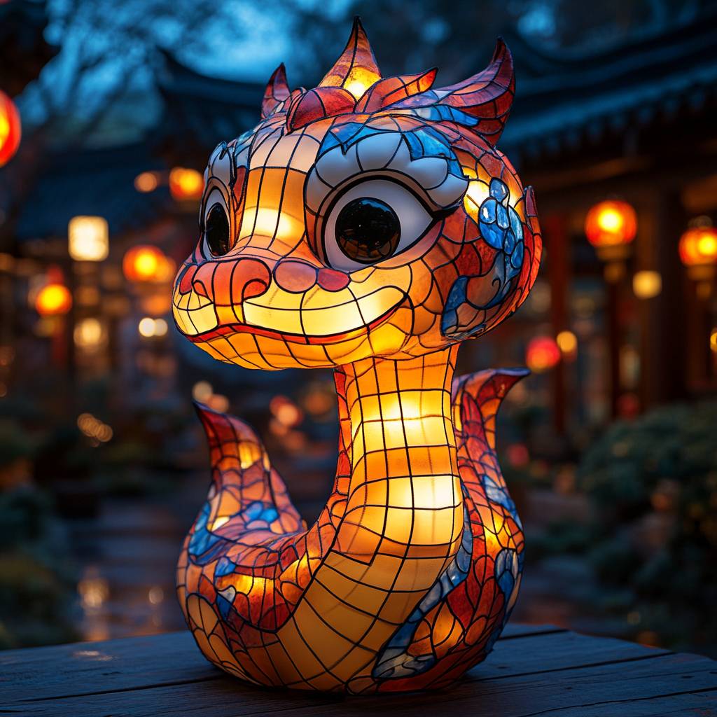 Snake head-shaped lantern, cartoon style, Q version, red, yellow, blue and white color matching, with lights inside. The frame is vaguely visible, with a simple structure. Festive and solemn. High details, super quality, wide-angle lens, 8k.