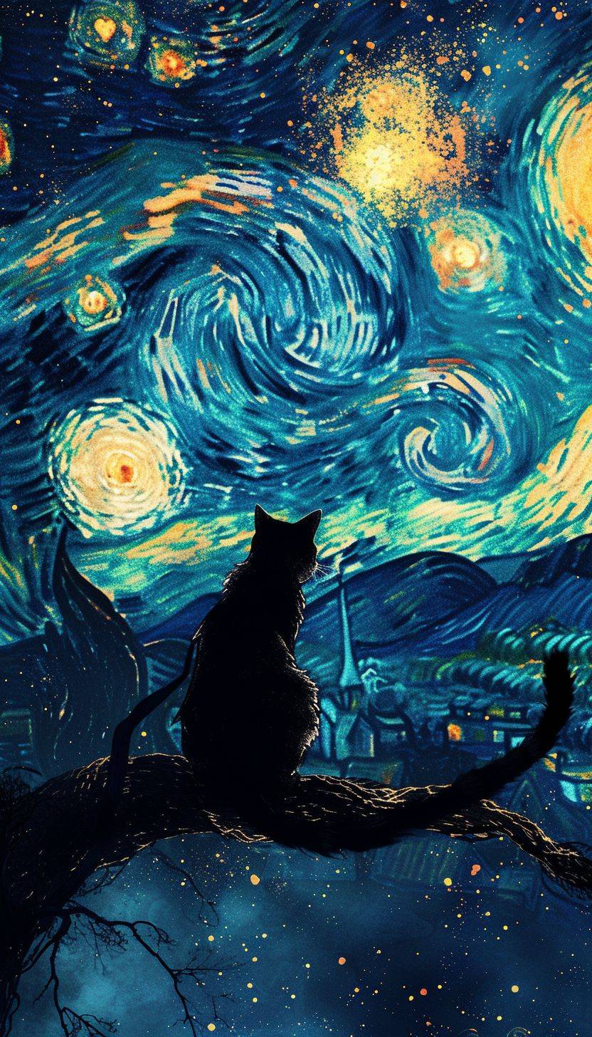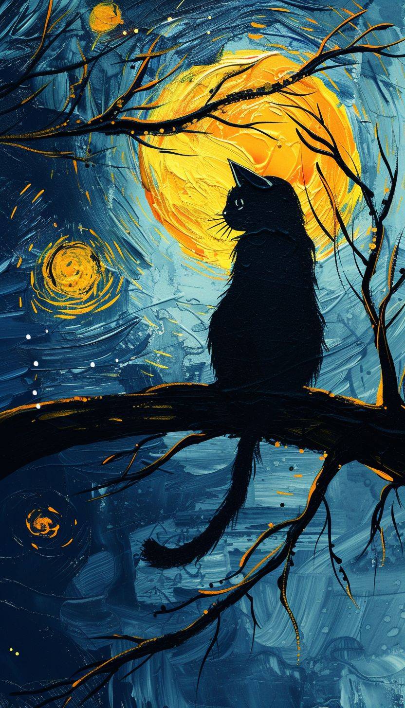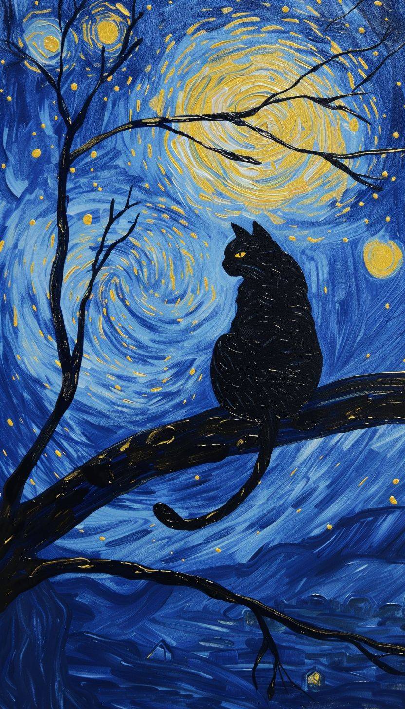 A silhouette of a cat on a tree branch, inspired by Van Gogh's Starry Night.