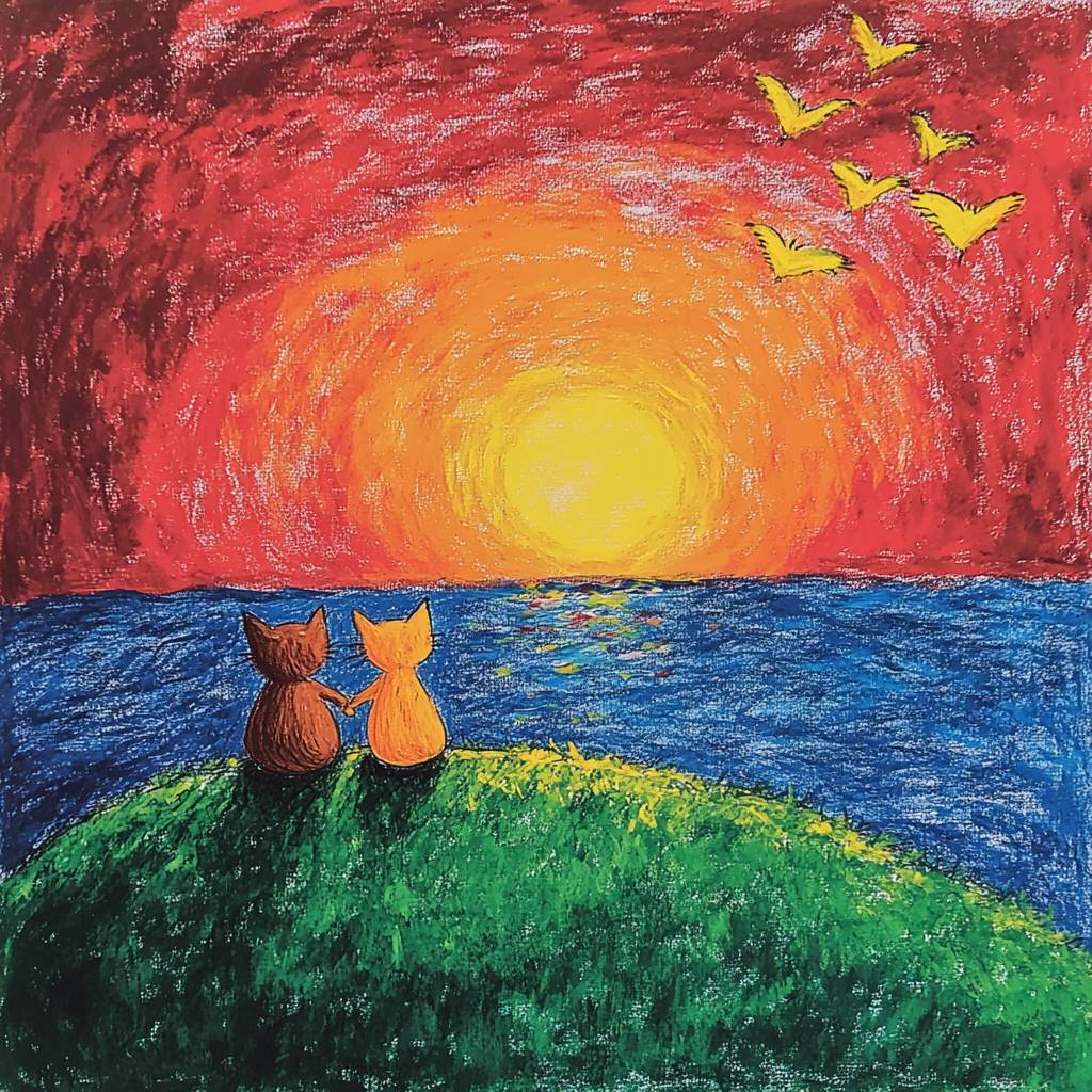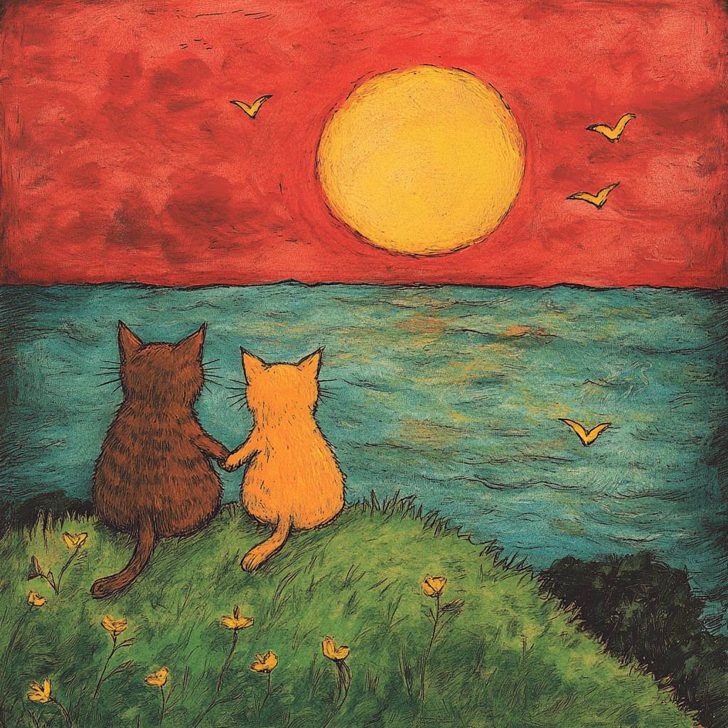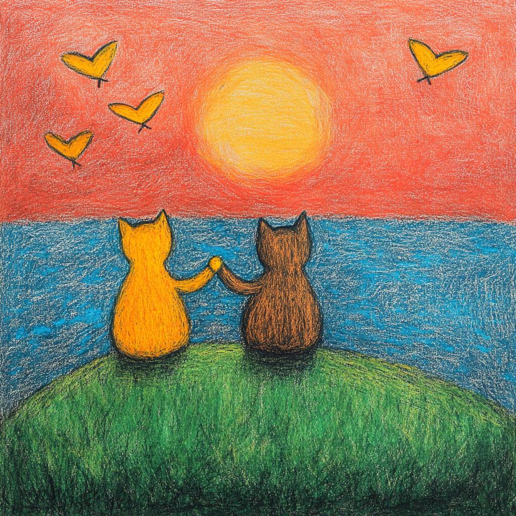 A brown and a yellow cat holding hands while sitting on a green hill on the left side of the drawing, looking over a sunrise where the red sky looms over a blue sea. Yellow birds are flying by. In the style of children’s drawing, lofi, low res, pastel, watercolour, renaissance. The cats are on the left edge of the painting.