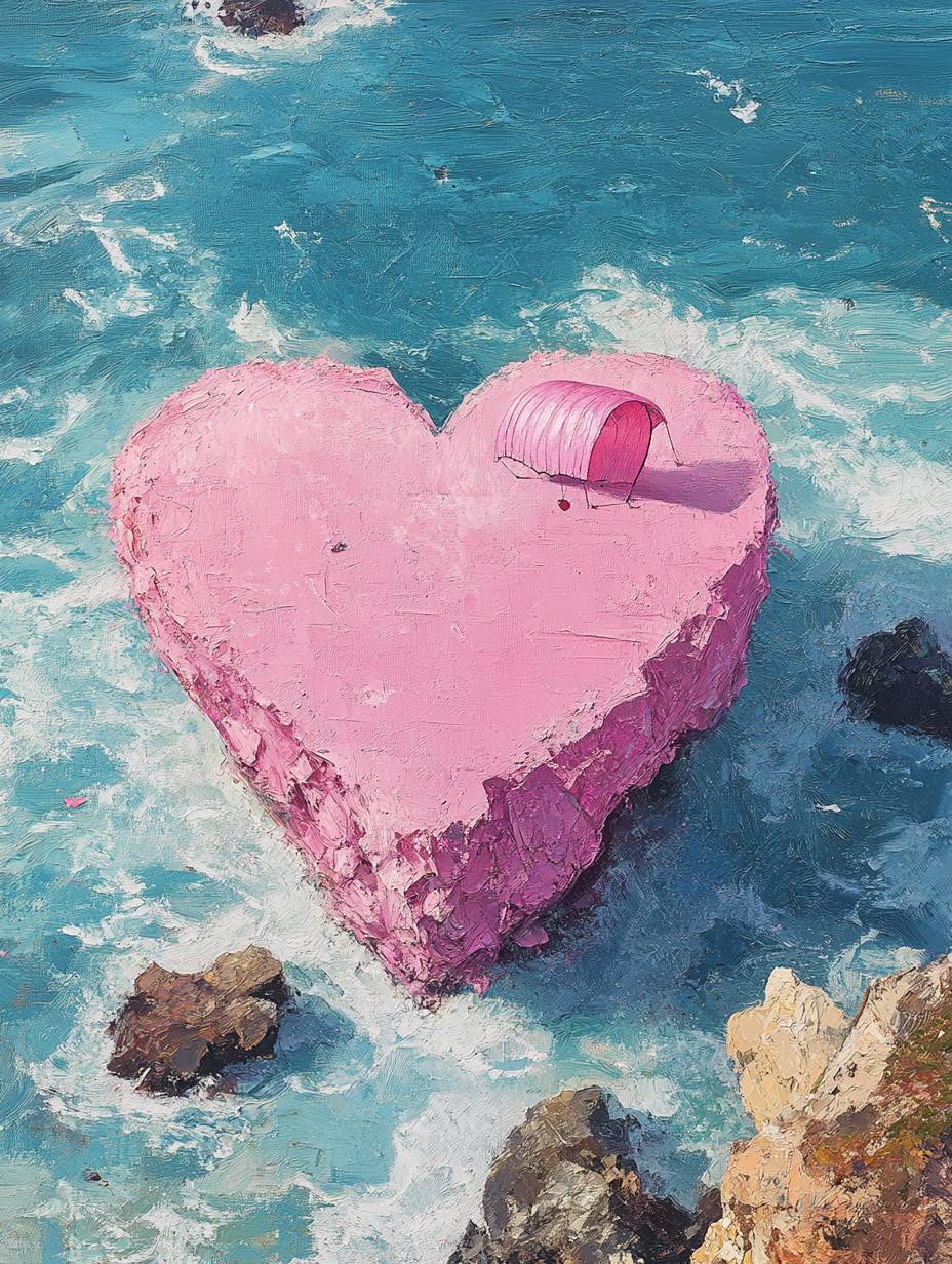 Classical oil painting, heart-shaped pink island, pink empty box, large top-down view, impact, sense of speed, pink parachute, pink clothing, romantic battlefield, da Vinci style, Renaissance period, aerial view, large top-down view, impact, ultra clear, ultra detailed --ar 3:4 --stylize 250 --v 6.1