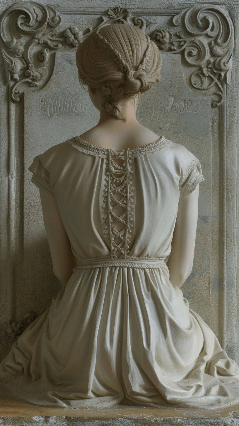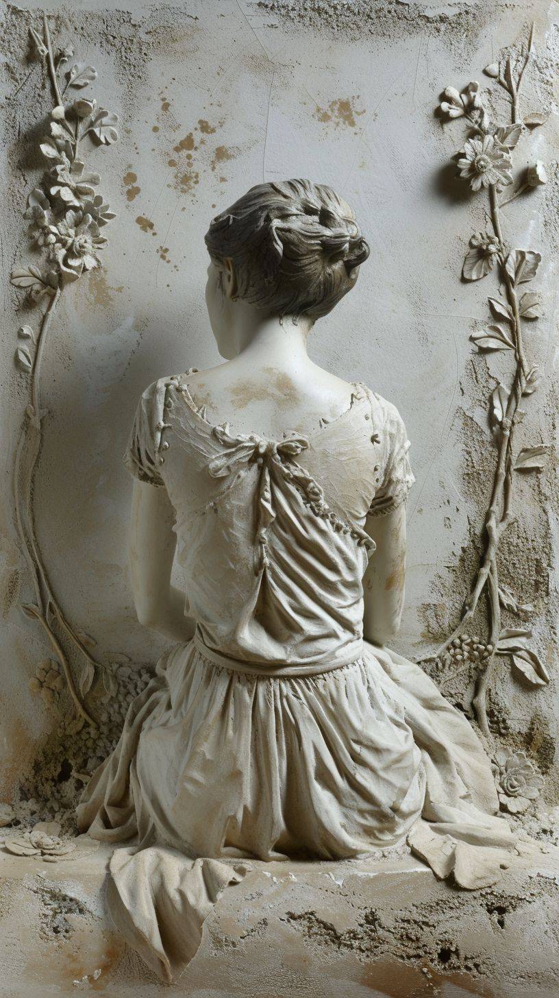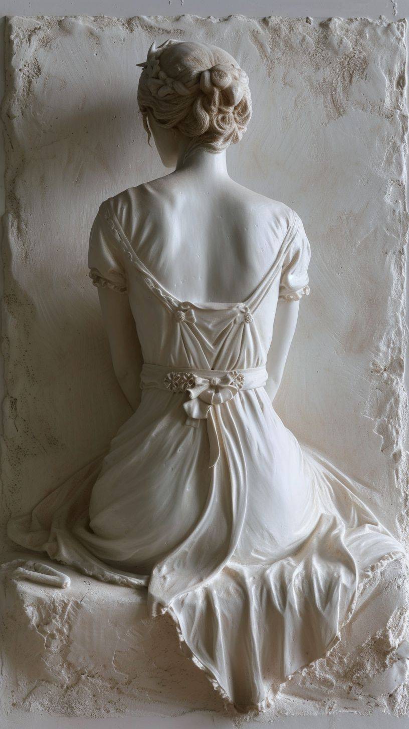 A bas-relief of a beautiful girl sitting, viewed from the back.