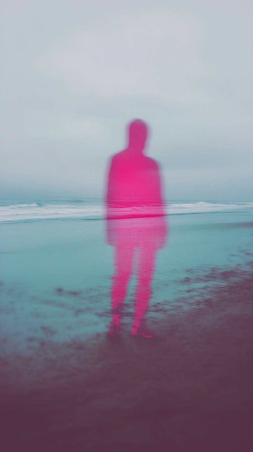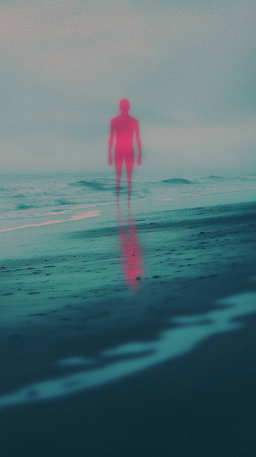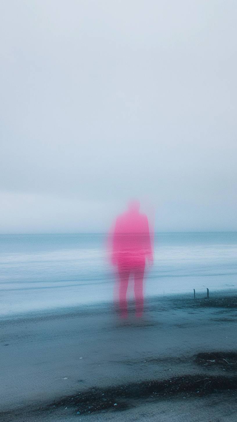 A blurry pink humanoid figure in red stands on the beach, contrasting with a mysterious background.
